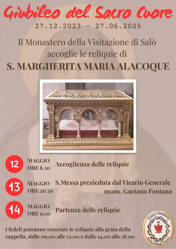 Lo scorso 27 dicembre 2023 è stato celebrato il 350° anniversario della prima delle apparizioni ed è iniziato il Giubileo del Cuore di Gesù che continuerà fino al 27 giugno 2025, data della Solennità del Sacro Cuore. Dall’esperienza mistica di santa Margherita Maria Alacoque, come dai suoi scritti, sorsero altre modalità di vivere la spiritualità del Cuore di Cristo, come la consacrazione al Sacro Cuore, personale, familiare e comunitaria e l’offerta della giornata, delle preghiere, azioni, gioie e sofferenze. Nella sua autobiografia, scrive che le apparizioni si aggirano sulla trentina di cui tre accompagnate da messaggi che chiedevano di dedicare una festa particolare al sacro Cuore nel primo venerdì dopo l’ottava del Corpus Domini e di riparare ogni primo venerdì del mese, con la comunione, le offese ricevute dagli uomini. A partire dalla sua comunità, il movimento per promuovere questa devozione non si arrestò più, nonostante gli ostacoli: Margherita è stata lo strumento privilegiato per la diffusione di un culto che era sempre esistito nella Chiesa sotto diverse forme, a lei però è stato chiesto di imprimere un orientamento nuovo, non più soltanto di contemplazione e di adorazione del Cuore di Gesù, ma anche di riparazione e di conversione di vita.