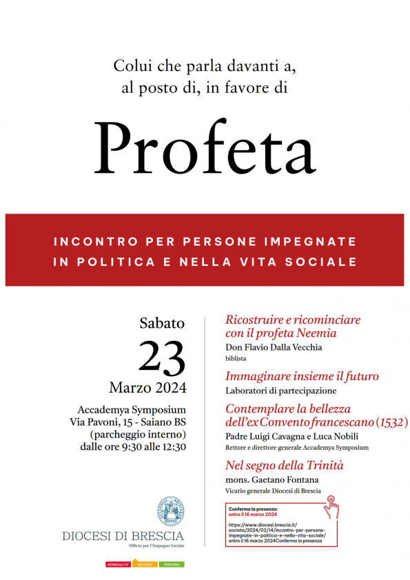 L’incontro per le persone impegnate in politica e nella vita sociale si terrà sabato 23 marzo 2024 dalle 9.30 alle 12.30 presso l’Accademia Symposium di Saiano (Via Pavoni, 15) e vuole essere un laboratorio di dialogo tra persone che vogliono vincere l’indifferenza per una possibilità di futuro condiviso.