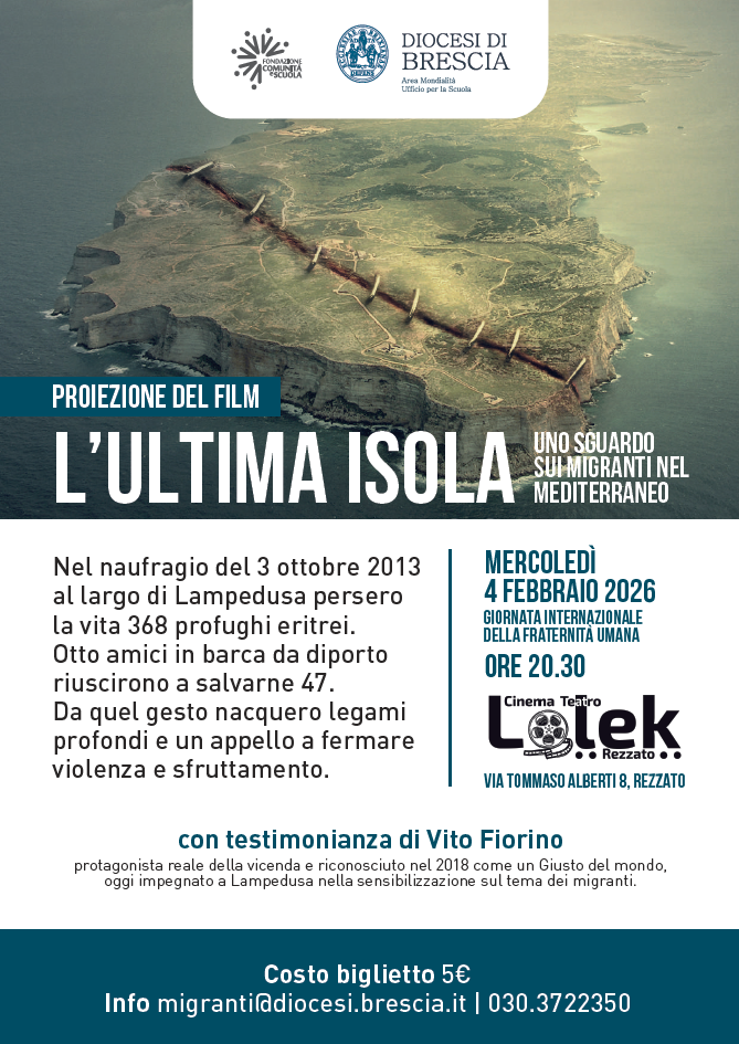 Mercoledì 4 febbraio 2026, alle ore 20.30, presso il Cinema Teatro Lolek di Rezzato, si terrà la proiezione del film L’ultima isola, promossa in occasione della Giornata internazionale della Fratellanza umana. Il film propone uno sguardo intenso e profondo sul tema delle migrazioni nel Mediterraneo,… Leggi di più