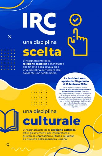 Le iscrizioni sono aperte dal 18 gennaio al 10 febbraio 2024. Per scegliere l’IRC si spunta la voce “Scelta di avvalersi dell’insegnamento della religione cattolica” tramite l’apposita sezione durante la procedura di iscrizione on-line alle classi prime di ogni ordine e grado, oppure mediante lo specifico modulo cartaceo (scheda B) per le sezioni della scuola dell’infanzia e per chi decide di avvalersi dell’IRC negli anni successivi al primo.
