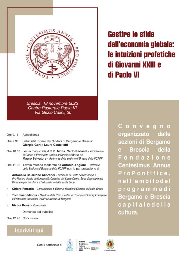 "Carissimi, pur nella consapevolezza dei tanti problemi quotidiani che le nostre comunità cristiane devono affrontare, non posso fare a meno di chiamarvi in causa in vista di un’occasione certamente importante e irripetibile: nel 2023 Brescia, unitamente a Bergamo, sarà “capitale italiana della cultura”. Questo significa che l’Italia e i paesi europei guarderanno più attentamente alle due città e ai loro rispettivi territori. Saranno molti, quindi, coloro che vorranno visitare e conoscere meglio le due città e le località più rinomate.