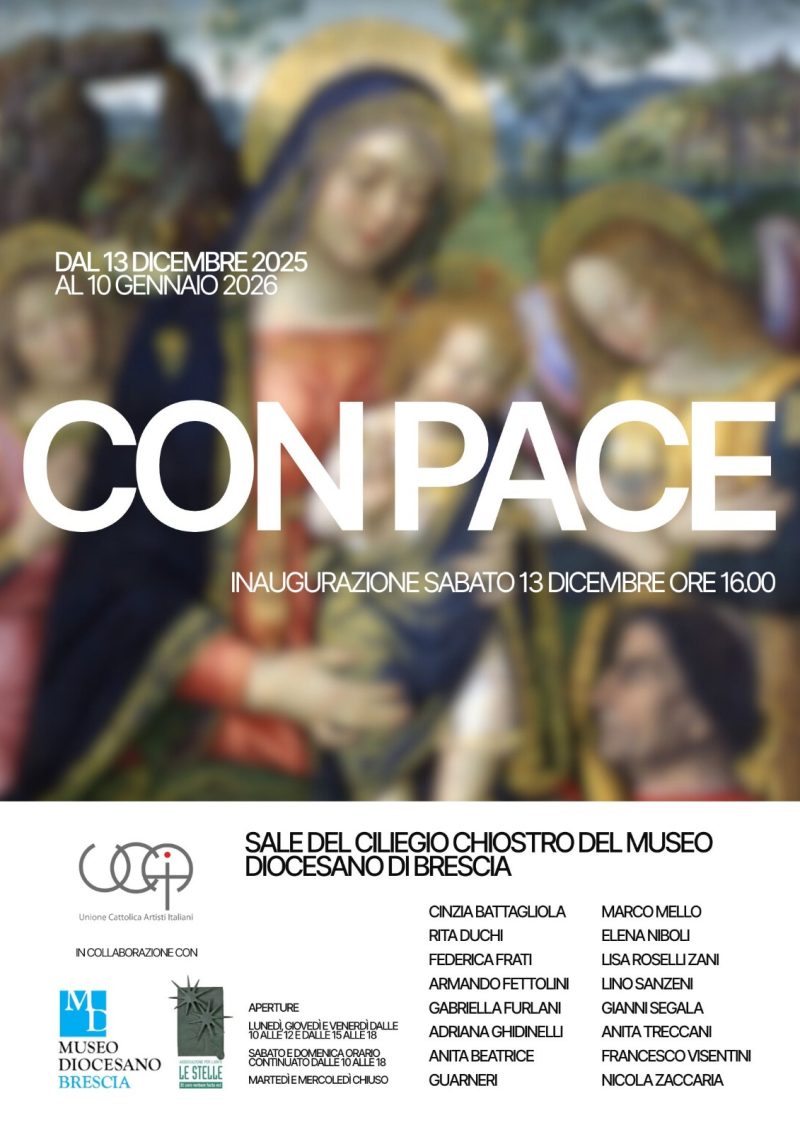 Sarà inaugurata sabato 13 dicembre alle ore 16.00, presso le Sale del Ciliegio del Chiostro del Museo Diocesano di Brescia, la mostra “Con Pace”, promossa dall’Unione Cattolica Artisti Italiani in collaborazione con il Museo Diocesano di Brescia e l’Associazione Le Stelle. L’esposizione, che rimarrà aperta fino al 10 gennaio 2026, propone una riflessione sul tema della pace attraverso le opere di numerosi artisti contemporanei, tra … Continua a leggere