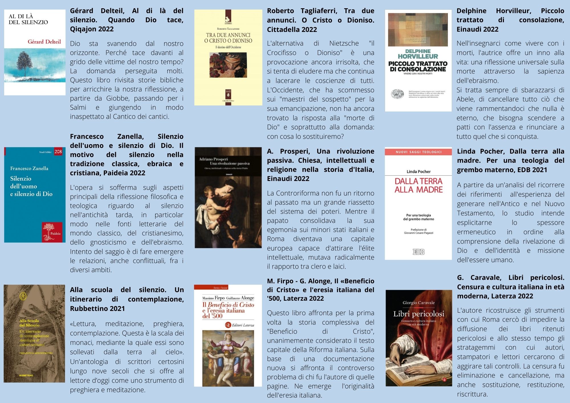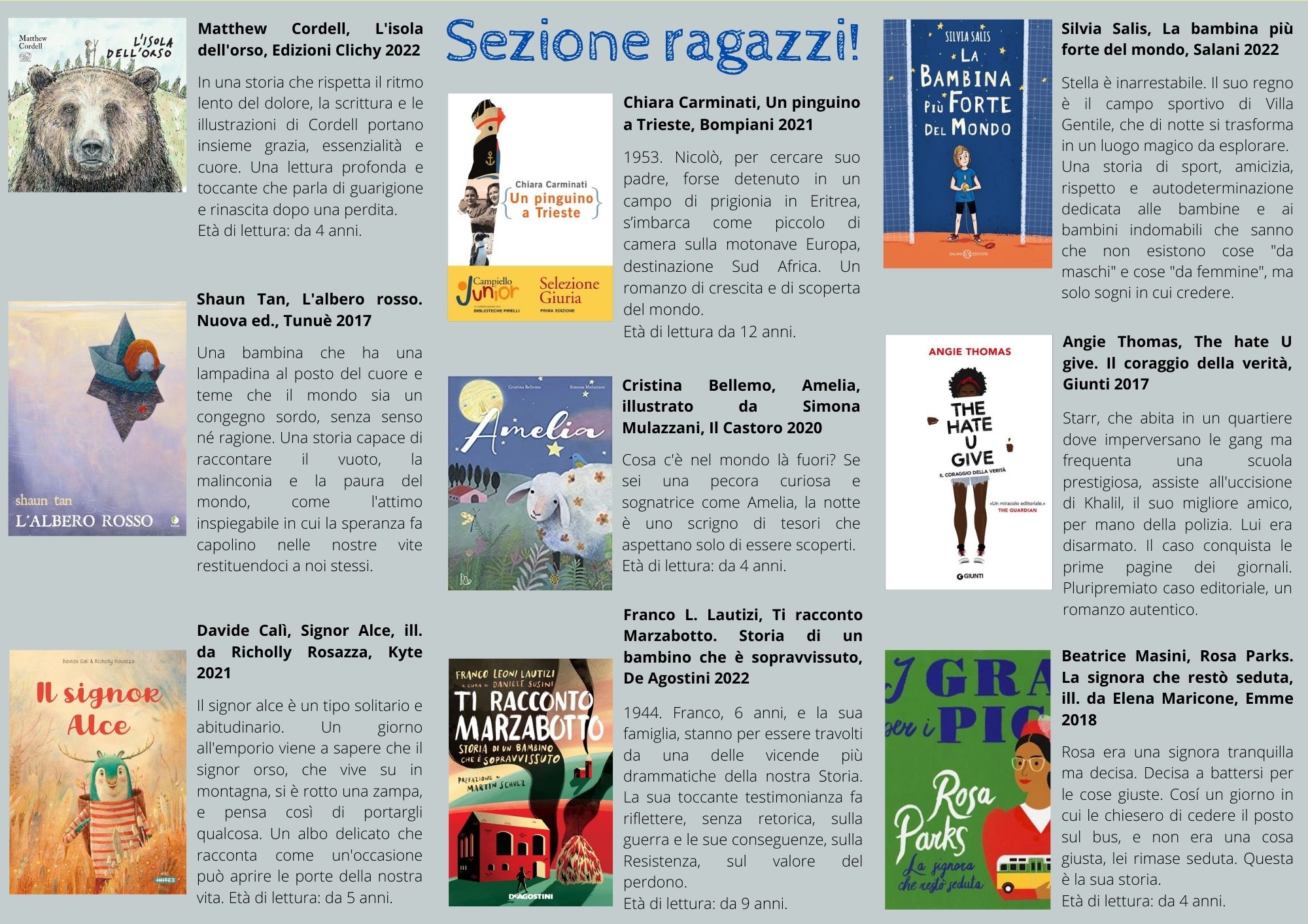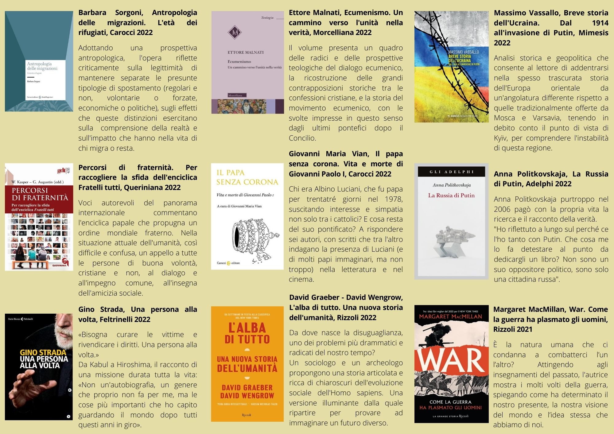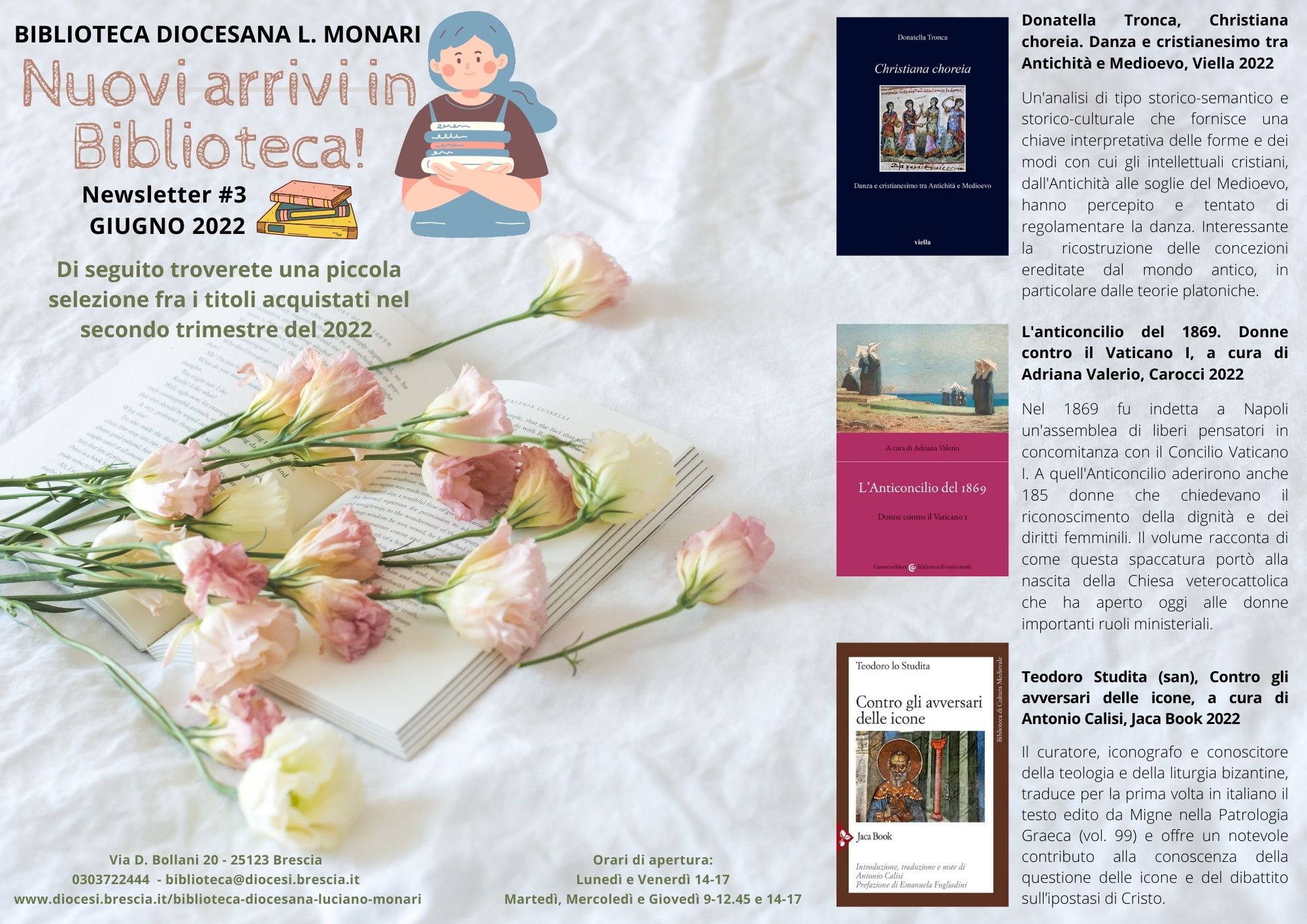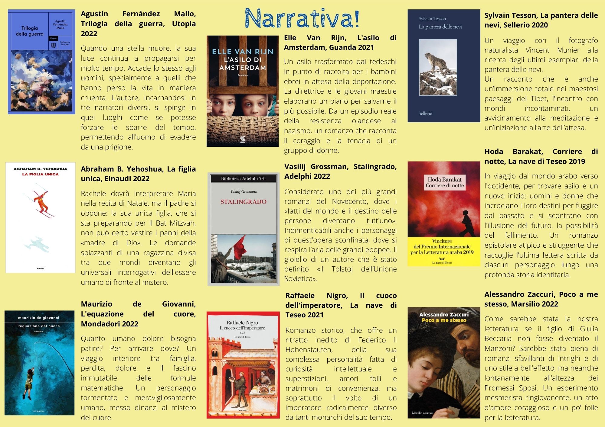 La biblioteca invia ai suoi lettori una newsletter, a cadenza trimestrale, che propone 57 titoli – con abstract – scelti fra le nuove acquisizioni. Sono presenti ogni volta precise sezioni dedicate alle opere di saggistica, alla narrativa, ai libri per bambini e ragazzi e ai film in DVD. Il pdf è scaricabile di seguito.