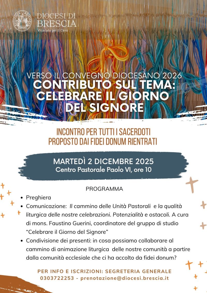 Per i sacerdoti che desiderano partecipare al Giubileo si chiede di confermare la propria presenza, e quella dell’eventuale accompagnatore, all’ufficio diocesano per l’Assistenza del clero dal lunedì al venerdì dalle ore 8.30 alle ore 12.30 – Tel. 030.3722.214/240; comunicando l’adesione al pranzo (ed eventuali intolleranze).