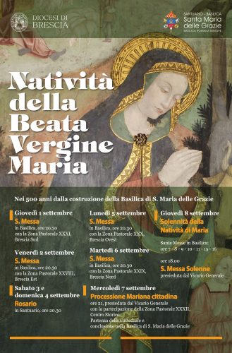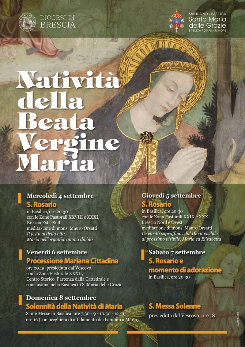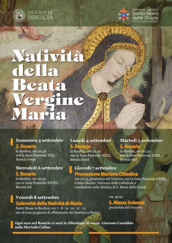 Santuario – Basilica di S. Maria delle Grazie Mercoledì 3 settembre – Processione Mariana Cittadina, ore 20.30, presieduta dal Vescovo, con la Zona Pastorale XXXII (Centro Storico). Partenza dalla Cattedrale e conclusione nella Basilica di S. Maria delle Grazie. Giovedì 4 settembre S. Rosario in Basilica, ore 20.30 con le Zona Pastorali XXVIII e XXXI, Brescia Est e Sud. Meditazione di don Antonio Zani Maria … Continua a leggere