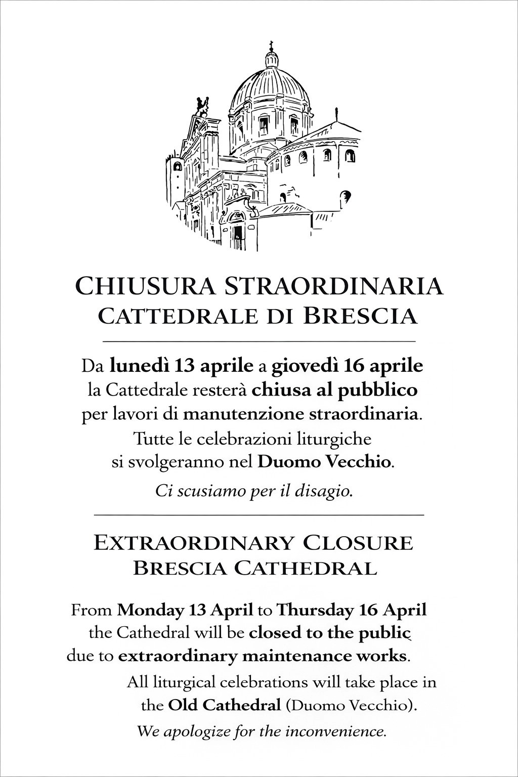L’origine dell’intero complesso, con lo scomparso battistero di San Giovanni Battista, è da collocarsi attorno al V secolo, mentre le attuali costruzioni risalgono rispettivamente al sec. XI, il Duomo Vecchio o Rotonda, e al sec. XVII con conclusione dei lavori nel sec. XIX, il Duomo Nuovo.