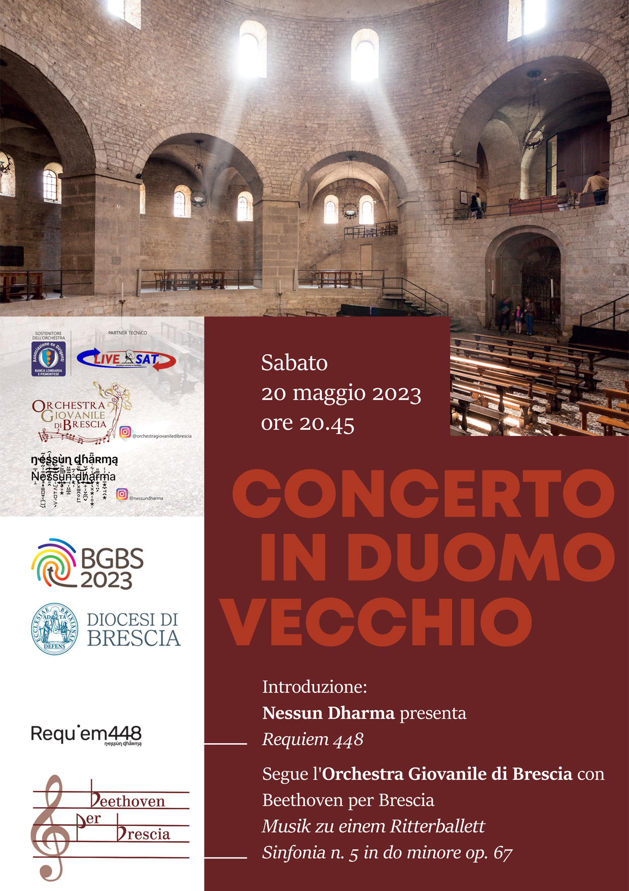 Introdurrà la serata l’opera multimediale Requiem 448 del duo artistico Nessun Dharma, seguita da Beethoven per Brescia, esecuzione del Musik zu einem Ritterballett e della Sinfonia n. 5 in do minore op. 67  da parte dell’Orchestra Giovanile di Brescia.
