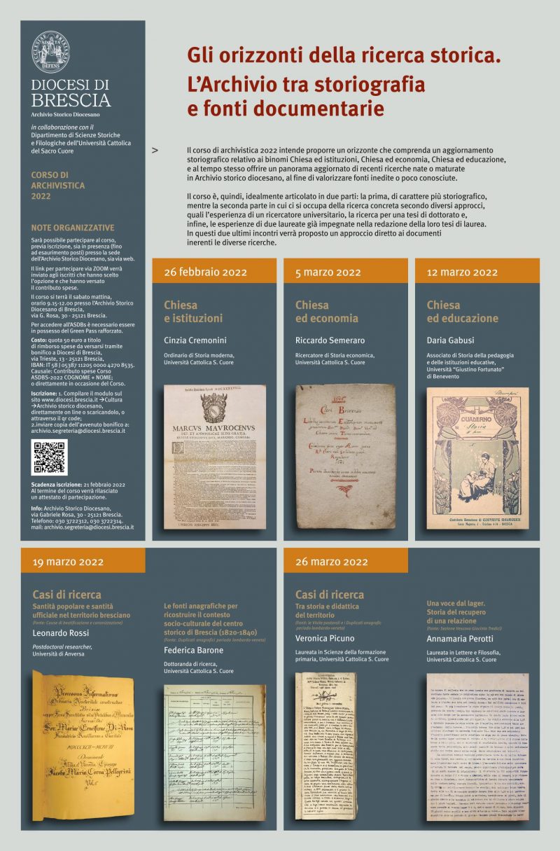 Il corso di archivistica 2022 intende proporre un orizzonte che comprenda un aggiornamento storiografico relativo ai binomi Chiesa ed istituzioni, Chiesa ed economia, Chiesa ed educazione, e al tempo stesso offrire un panorama aggiornato di recenti ricerche nate o maturate in Archivio storico diocesano, al fine di valorizzare fonti inedite o poco conosciute.