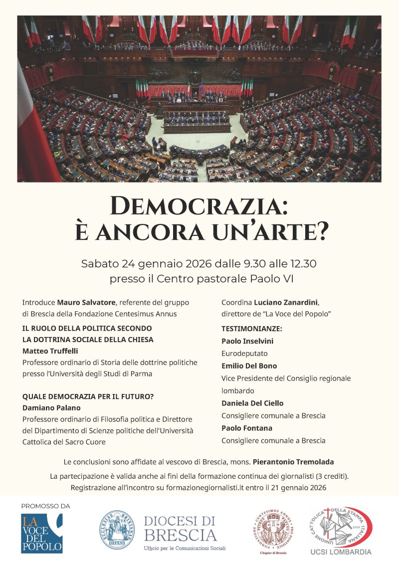 Sabato 24 gennaio (dalle 9.30 alle 12.30) al Centro pastorale Paolo VI di Brescia, incontro promosso da “La Voce del Popolo”, dall’Ufficio diocesano per le comunicazioni sociali, dalla Fondazione Centesimus Annus e da Ucsi Lombardia.