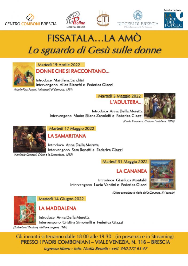 “Fissatala… La amò” è un percorso proposto da un gruppo di donne cristiane, che ci ricordano come Gesù, prima di tutti, abbia promosso la dignità della donna e indicato il giusto posto e la sua preziosità nella società e nella Chiesa. Per questo ci è offerto questo breve itinerario biblico, dove al centro ci sono Gesù e alcune donne, che, nell’incontro con il Maestro, riscoprono la propria identità e dignità e diventano testimoni della Buona Novella.