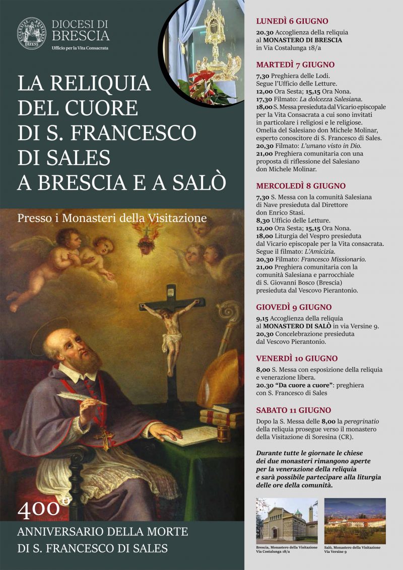 In occasione del 400° anniversario della morte di S. Francesco di Sales, la peregrinatio della reliquia del cuore del Santo passerà dai monasteri della Visitazione della diocesi di Brescia.