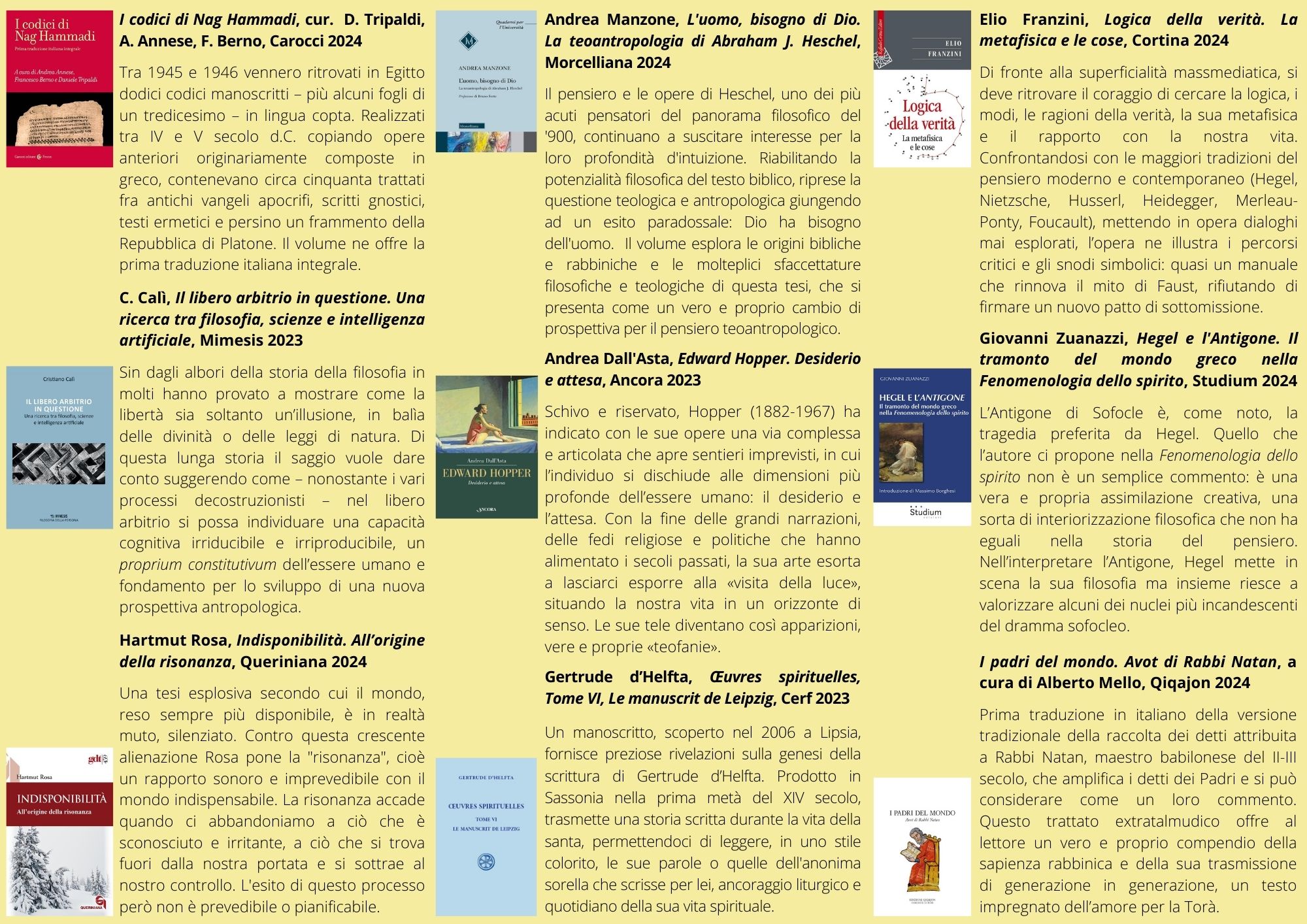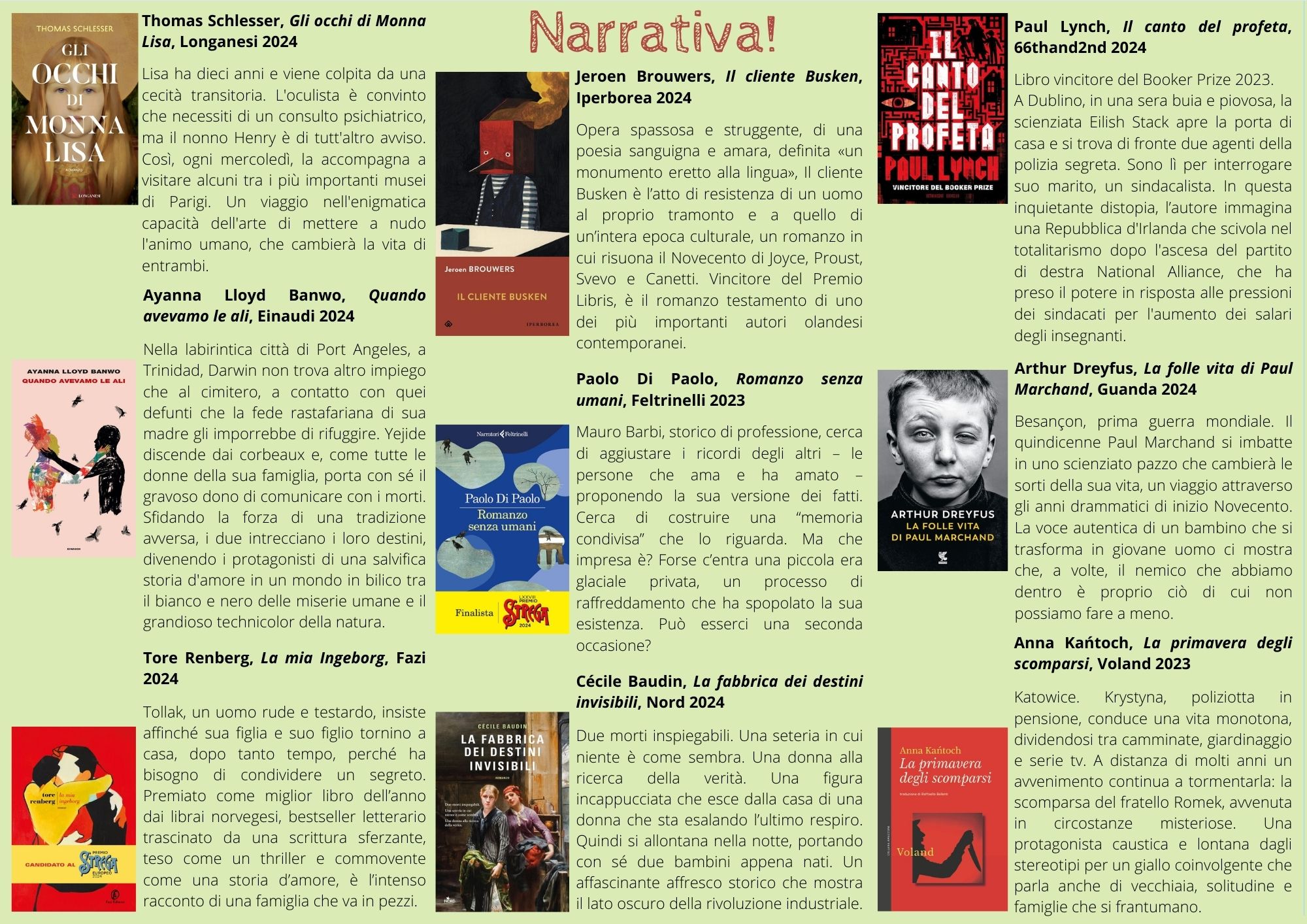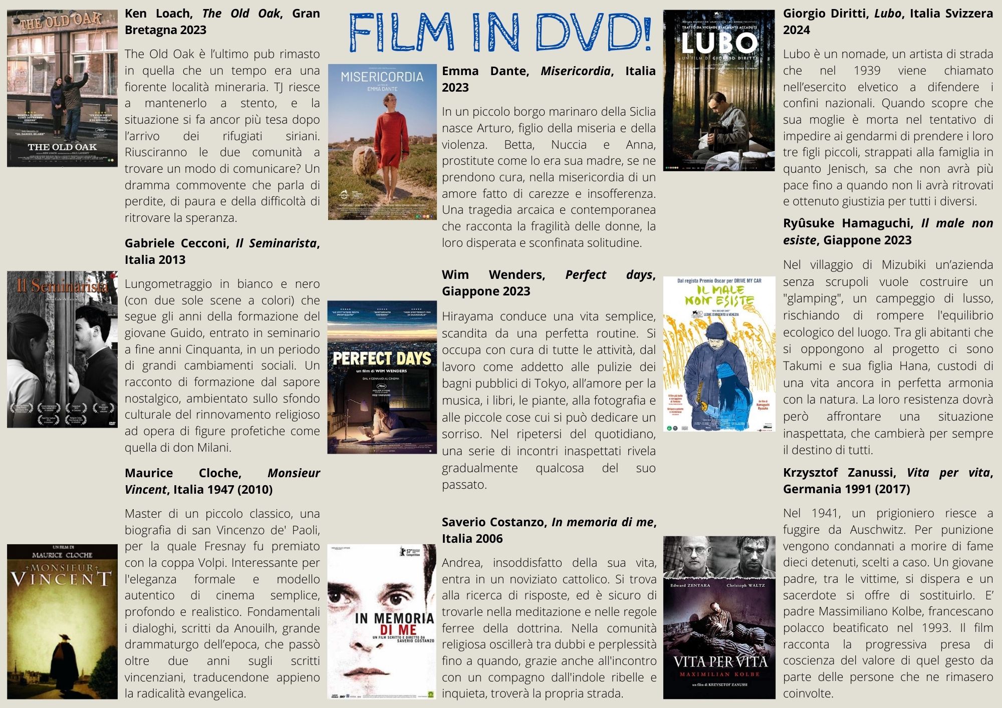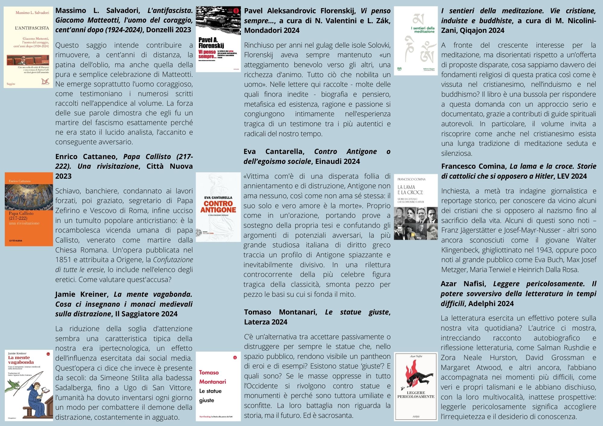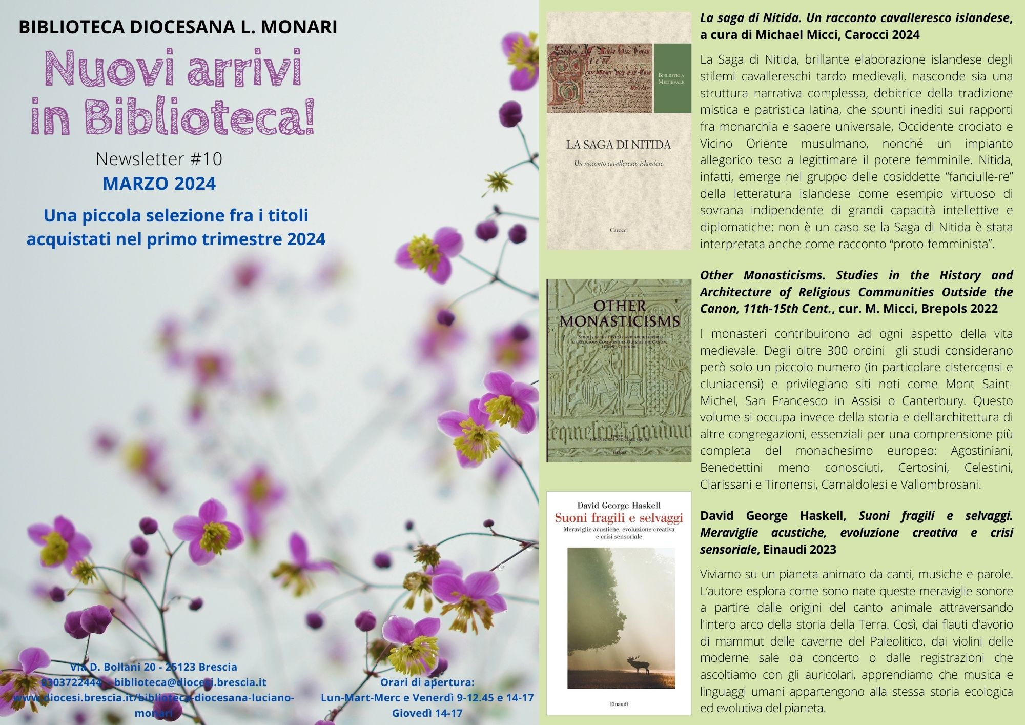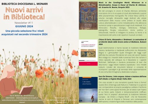 Biblioteca Diocesana, Diocesi 11 Luglio 2024 Newsletter 11 – giugno 2024 La biblioteca invia ai suoi lettori una newsletter, a cadenza trimestrale, che propone 57 titoli – con abstract – scelti fra le nuove acquisizioni. Sono presenti ogni volta precise sezioni dedicate alle opere di saggistica, alla narrativa, ai libri per bambini e ragazzi e ai film in DVD. Newsletter 11 - giugno 2024
