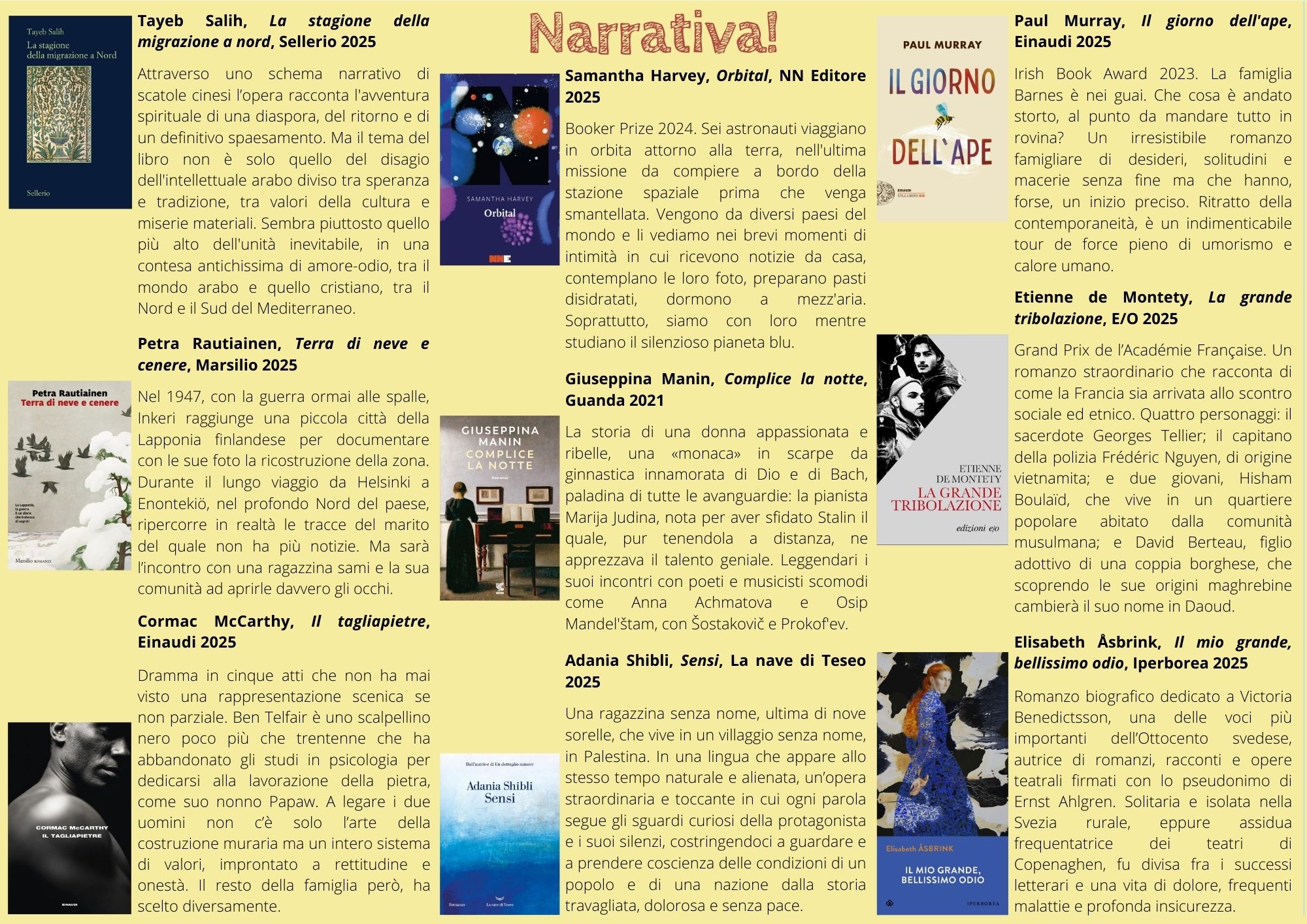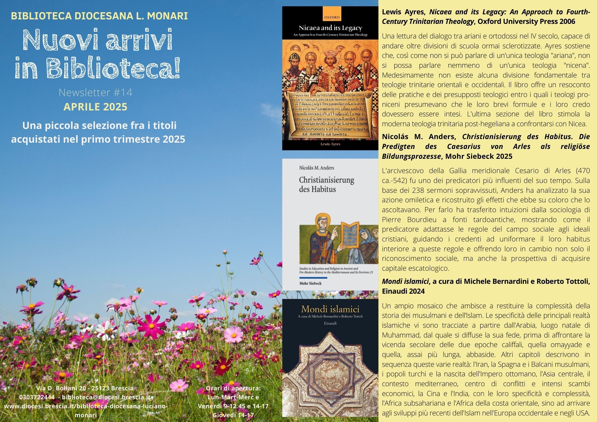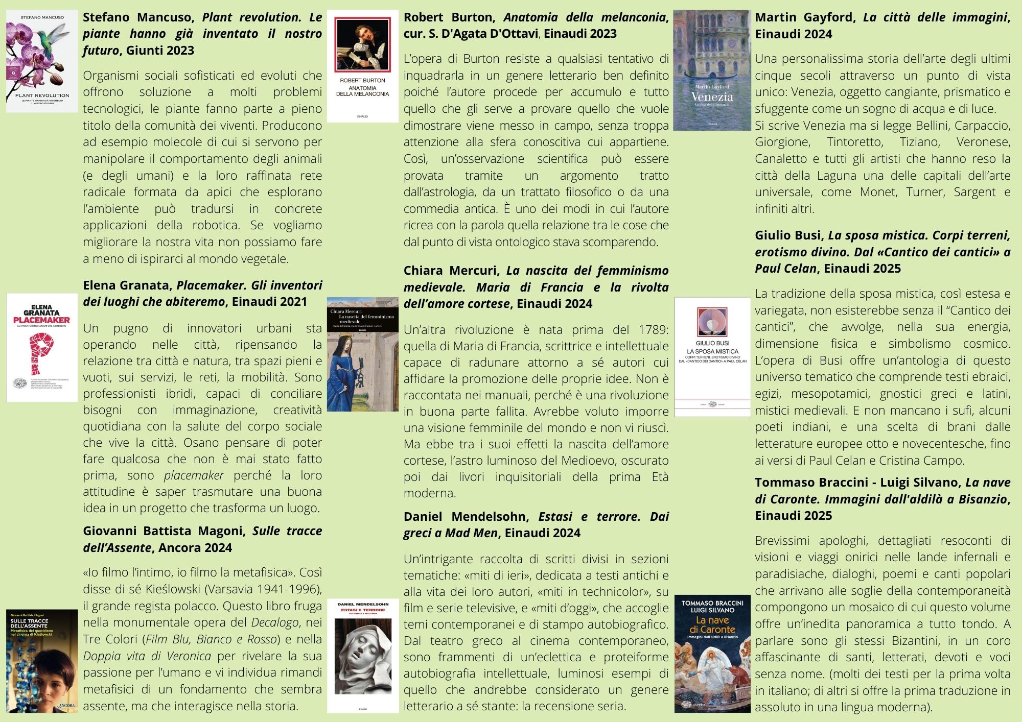 La biblioteca invia ai suoi lettori una newsletter, a cadenza trimestrale, che propone 57 titoli – con abstract – scelti fra le nuove acquisizioni. Sono presenti ogni volta precise sezioni dedicate alle opere di saggistica, alla narrativa, ai libri per bambini e ragazzi e ai film in DVD.
