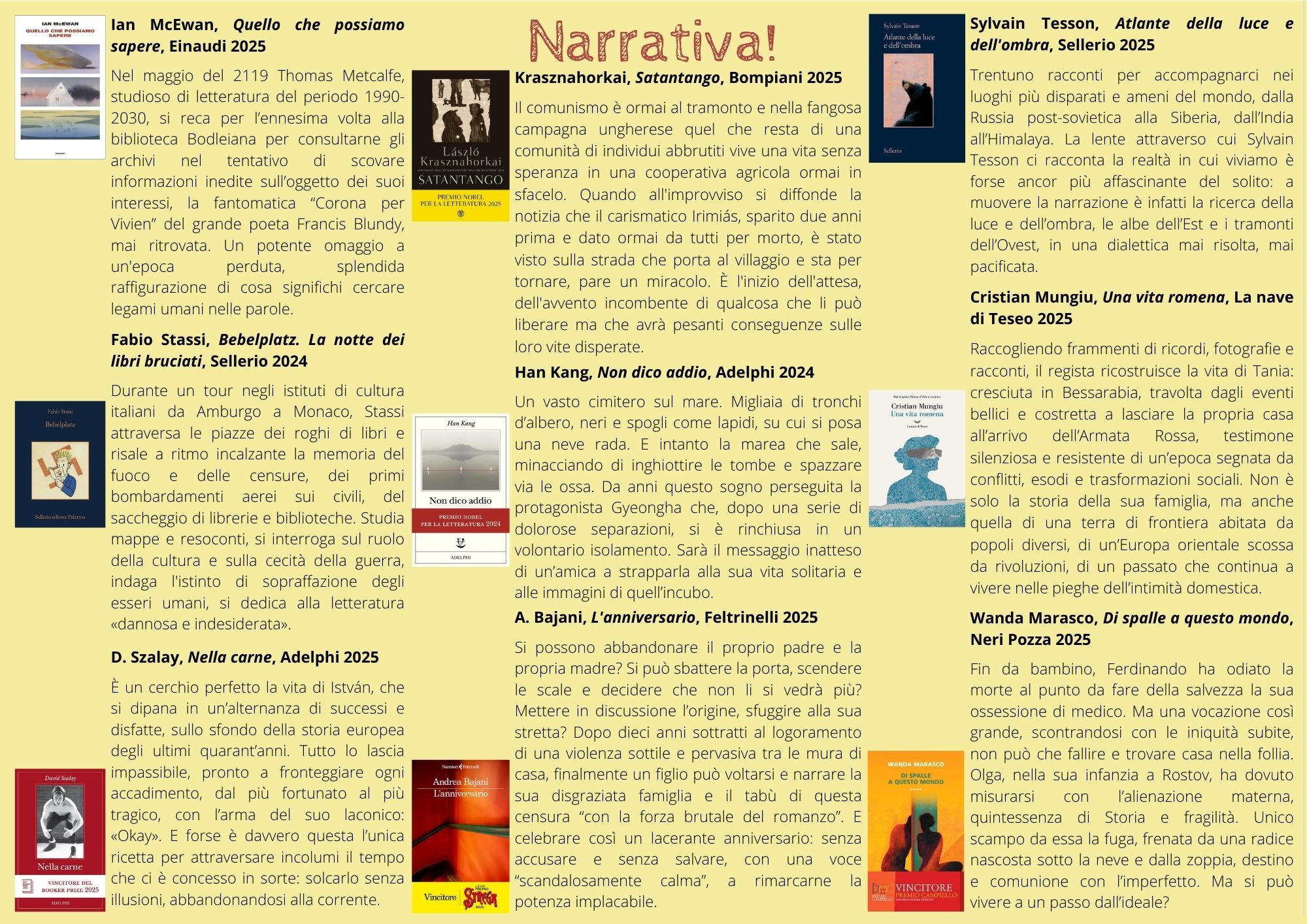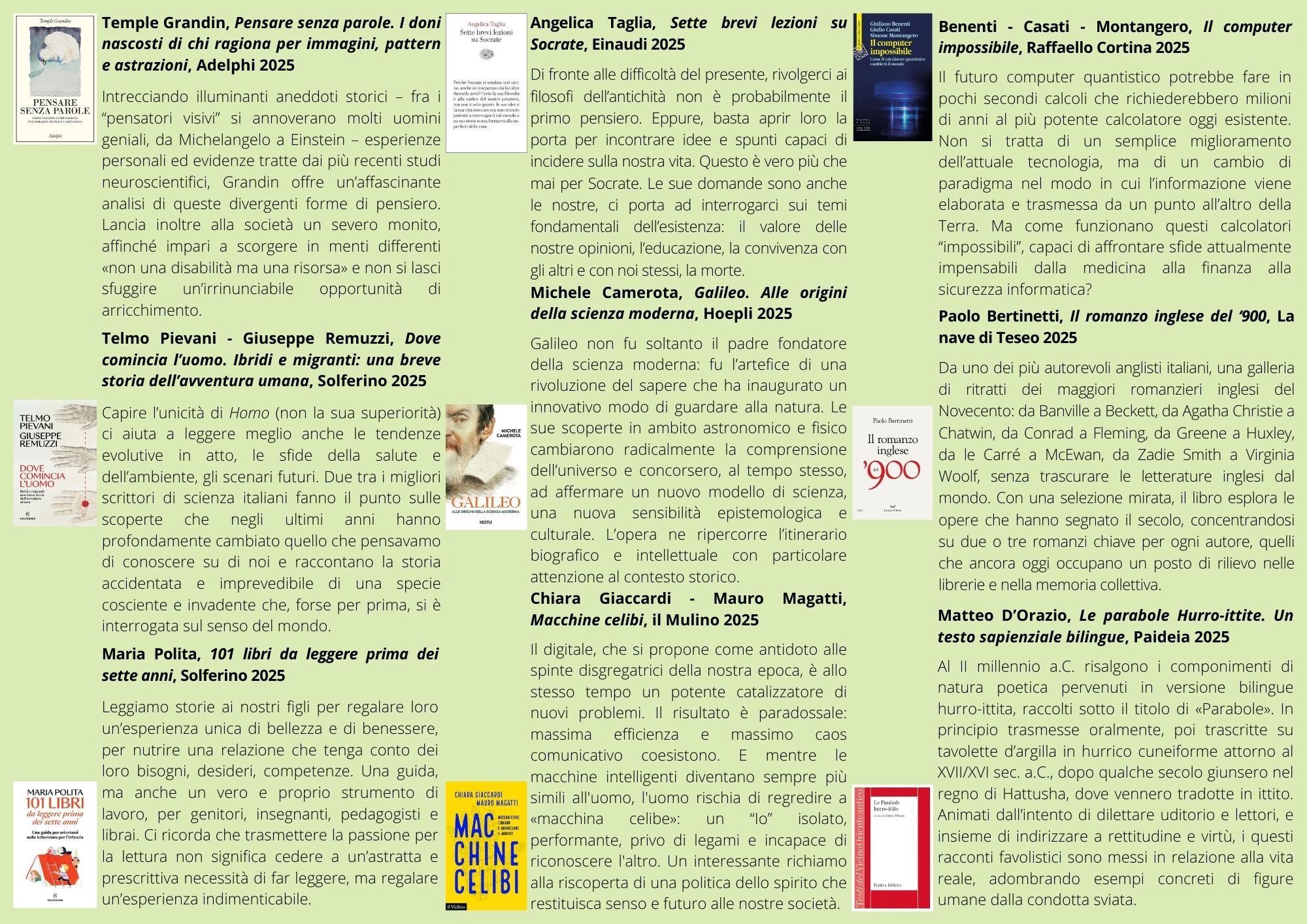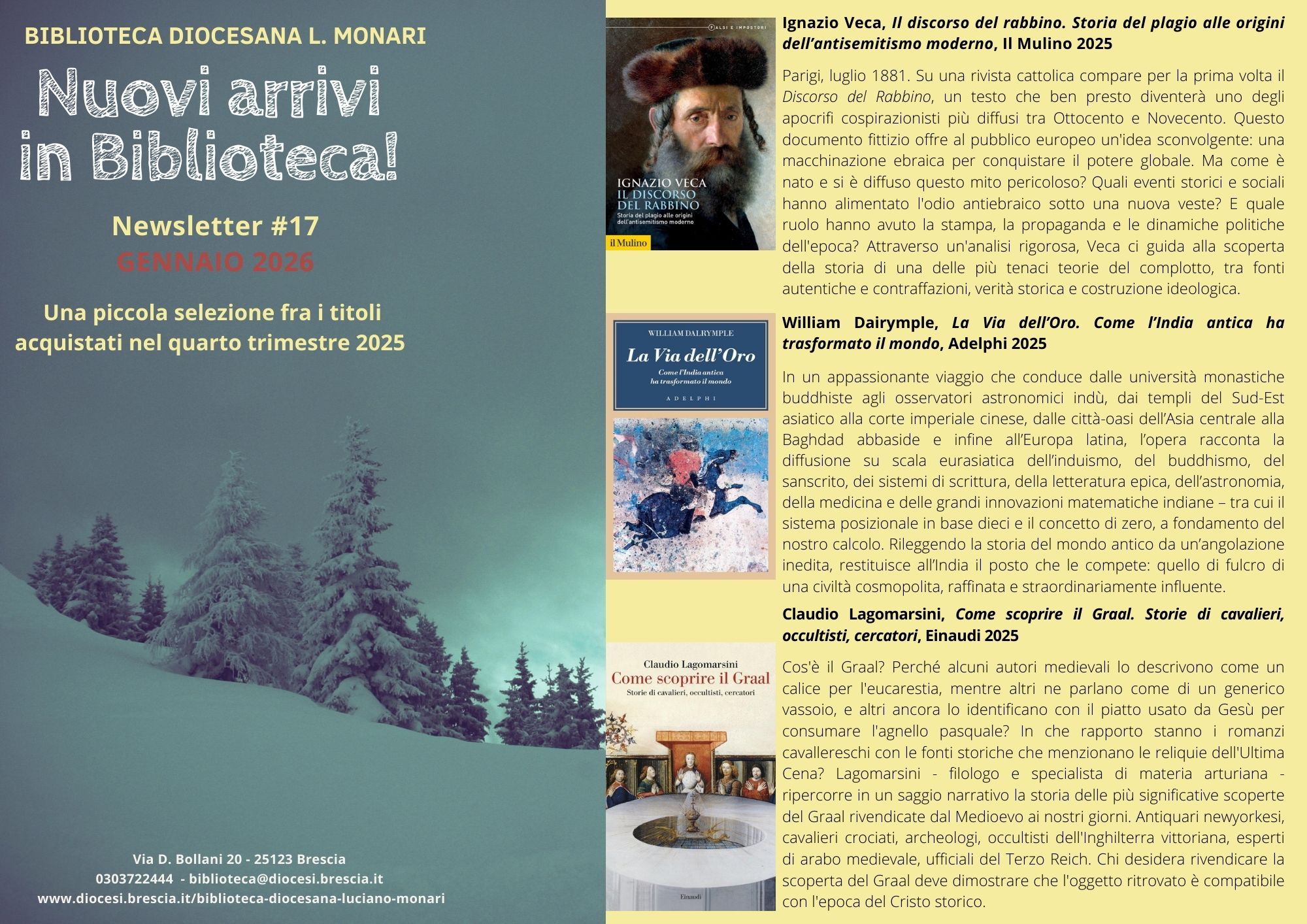 La biblioteca invia ai suoi lettori una newsletter, a cadenza trimestrale, che propone 57 titoli – con abstract – scelti fra le nuove acquisizioni. Sono presenti ogni volta precise sezioni dedicate alle opere di saggistica, alla narrativa, ai libri per bambini e ragazzi e ai film in DVD.