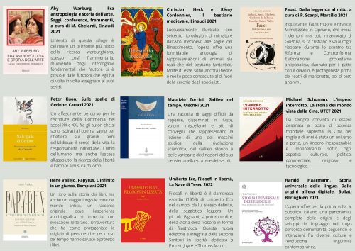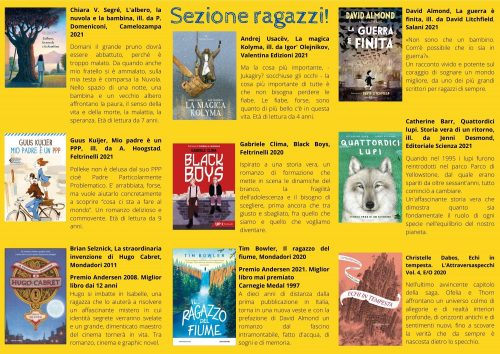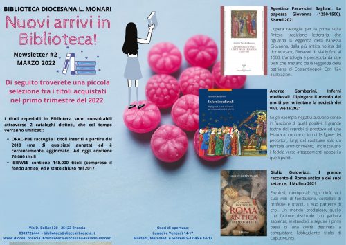 La biblioteca invia ai suoi lettori una newsletter, a cadenza trimestrale, che propone 57 titoli – con abstract – scelti fra le nuove acquisizioni. Sono presenti ogni volta precise sezioni dedicate alle opere di saggistica, alla narrativa, ai libri per bambini e ragazzi e ai film in DVD.
