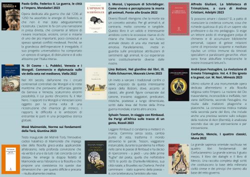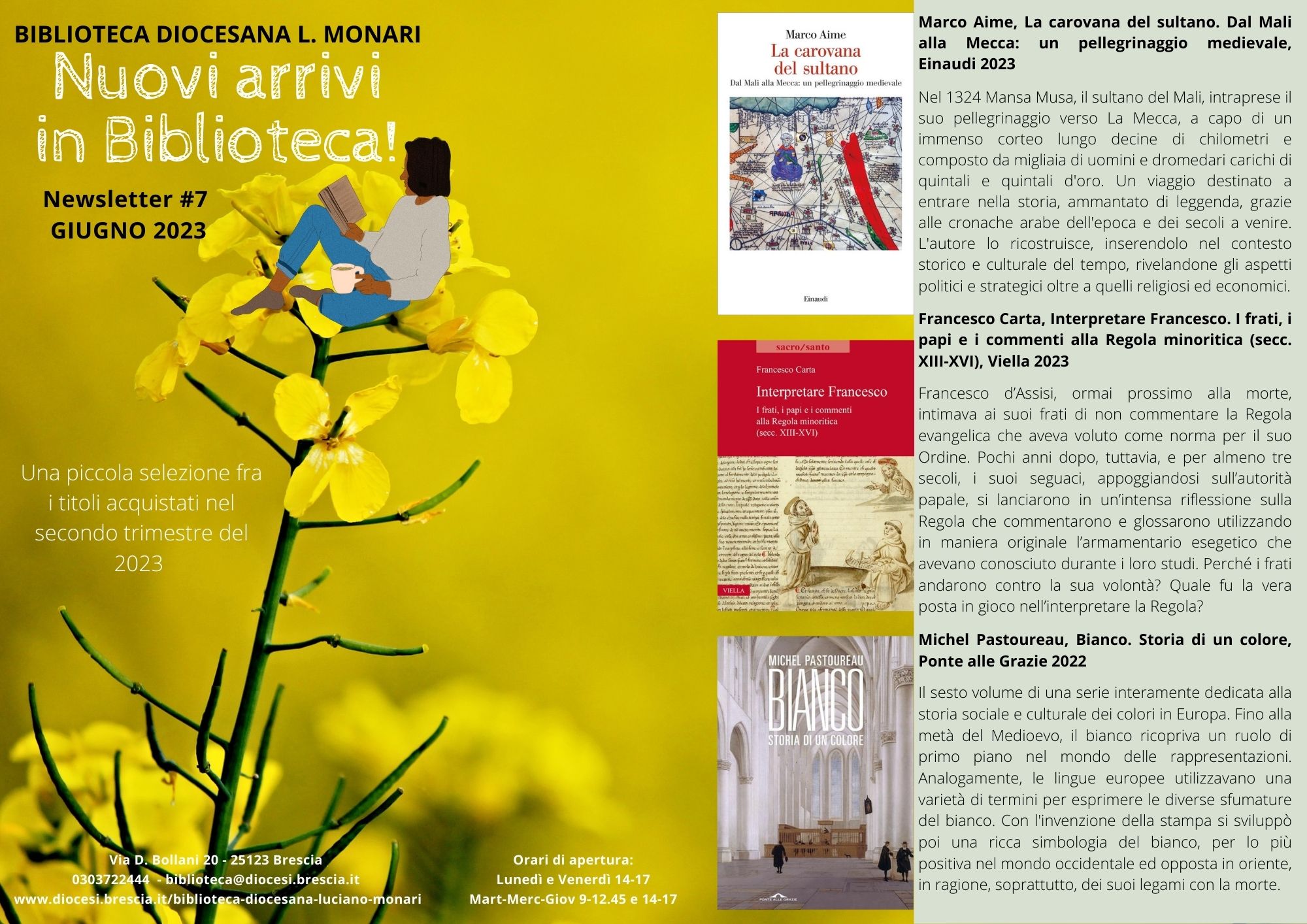 La biblioteca invia ai suoi lettori una newsletter, a cadenza trimestrale, che propone 57 titoli – con abstract – scelti fra le nuove acquisizioni. Sono presenti ogni volta precise sezioni dedicate alle opere di saggistica, alla narrativa, ai libri per bambini e ragazzi e ai film in DVD.