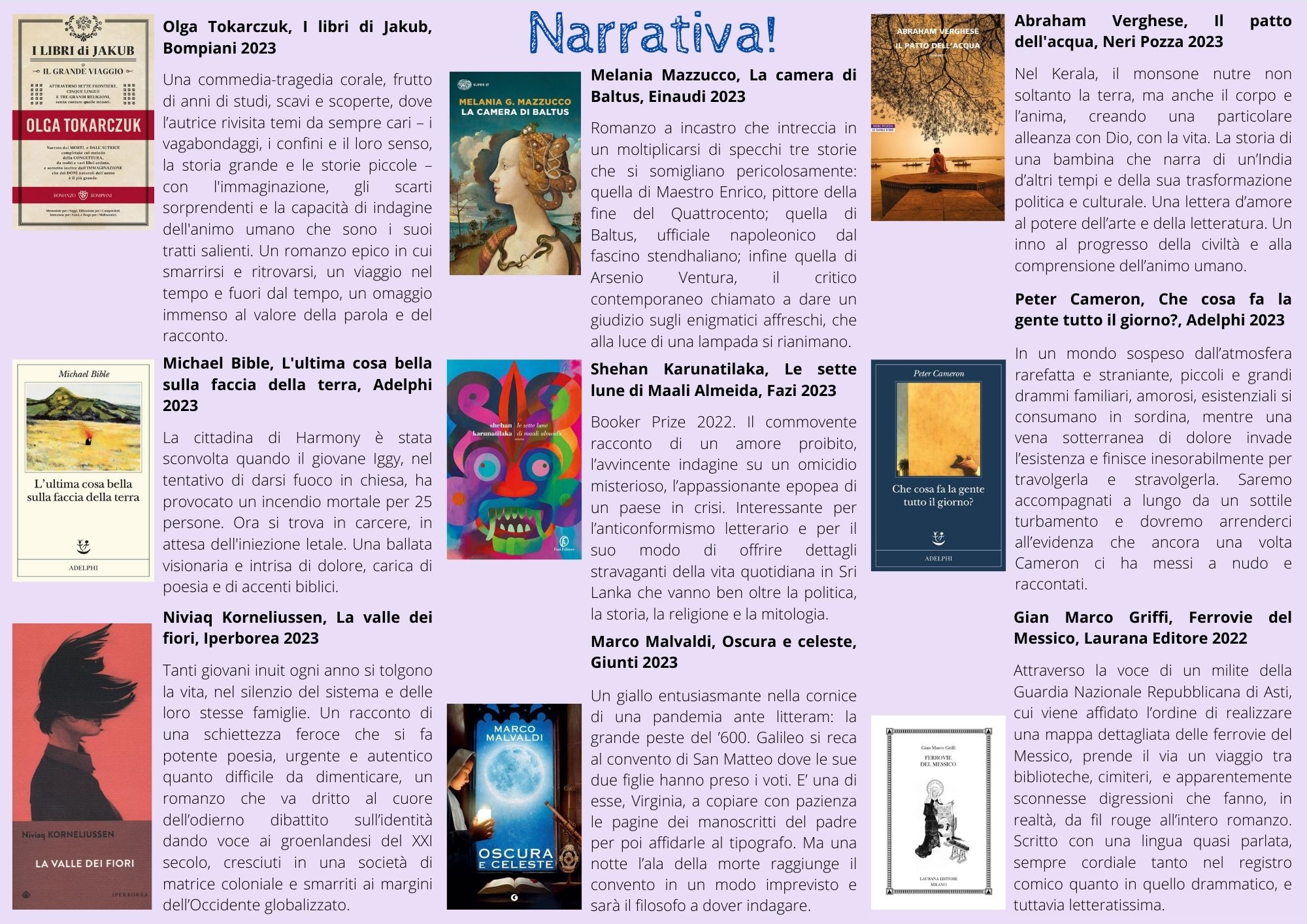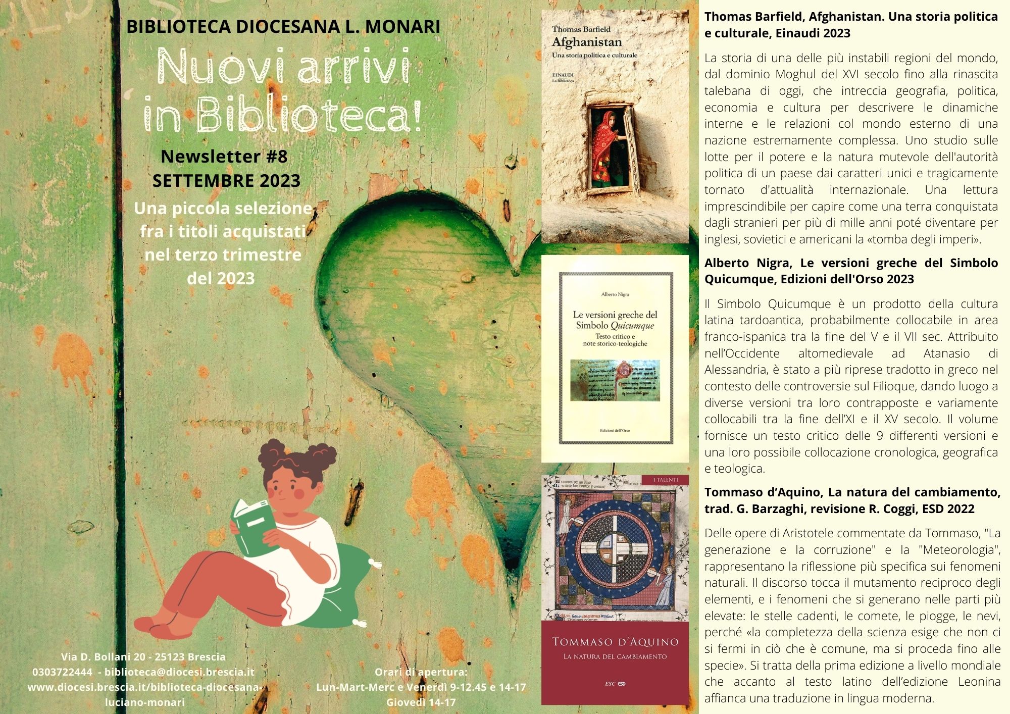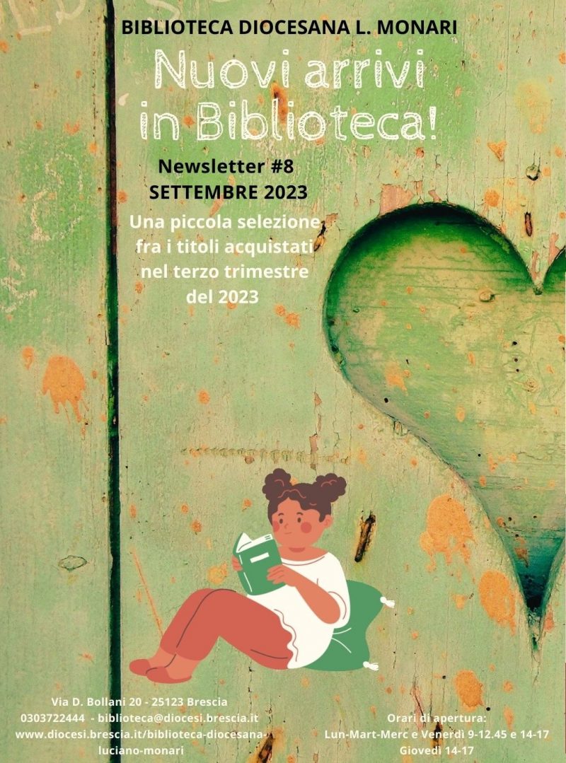 La biblioteca invia ai suoi lettori una newsletter, a cadenza trimestrale, che propone 57 titoli – con abstract – scelti fra le nuove acquisizioni. Sono presenti ogni volta precise sezioni dedicate alle opere di saggistica, alla narrativa, ai libri per bambini e ragazzi e ai film in DVD.