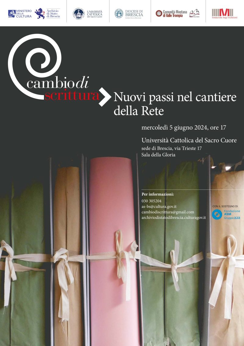 Un anno fa si inaugurava il progetto Cambio di scrittura, promosso da Archivio di stato, Archivio storico diocesano, Università Cattolica del S. Cuore e Sistema archivistico di Valle Trompia con il sostegno di Fondazione ASM: pensato per mettere in comunicazione gli archivi del territorio bresciano, cerca ora, con questo convegno, di riflettere su quanto fatto e soprattutto sugli sviluppi futuri. L’appuntamento è per il prossimo 5 giugno in Università Cattolica dalle 17 alle 19 presso la Sala della Gloria. Un momento di riflessione per gli archivi, aperti al confronto e stimolati a trovare nuove vie di progettazione e azione condivisa.