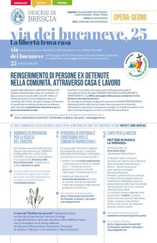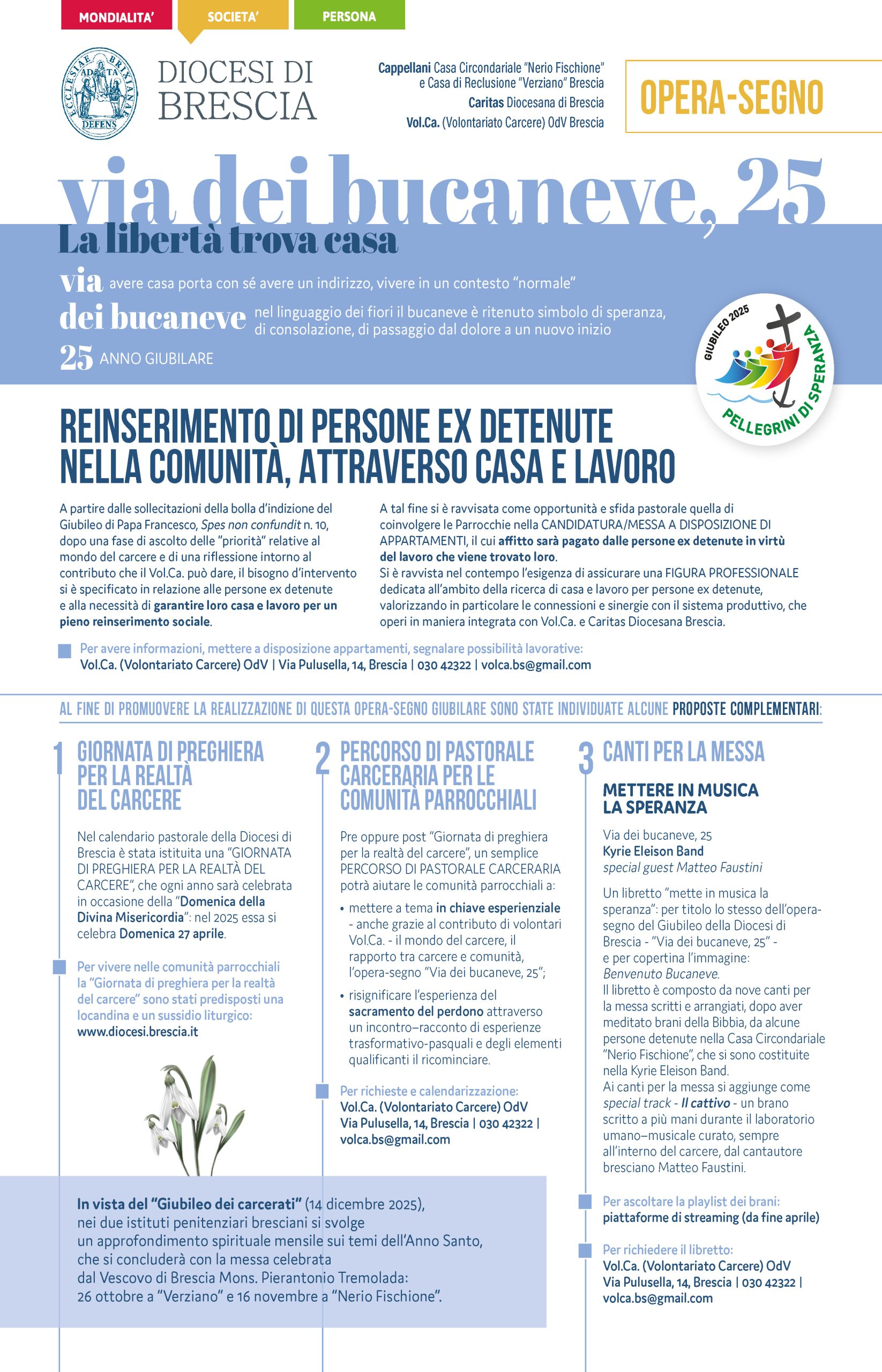 Si propone come opera-segno della Diocesi di Brescia un progetto diffuso di reinserimento nella comunità di persone che hanno terminato di scontare la loro pena. Il progetto prende il nome di “Via dei Bucaneve, 25: la libertà trova casa”.
