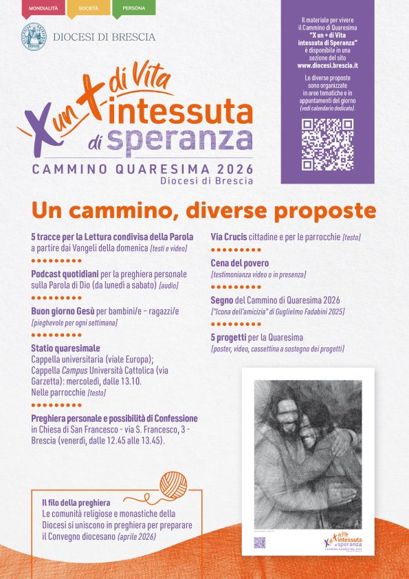 “Per un più di vita” è il messaggio che accompagna ogni proposta a disposizione delle parrocchie: la lettura condivisa del Vangelo delle domeniche di quaresima, il podcast quotidiano, la preghiera dei bambini per dare ogni giorno il “buongiorno a Gesù”, la cena povera, il digiuno del venerdì, la preghiera della Via crucis, le testimonianze missionarie, la lampada della preghiera nei monasteri.