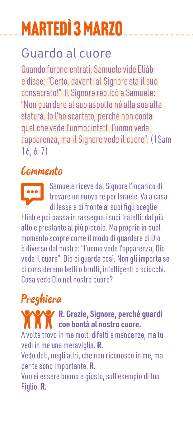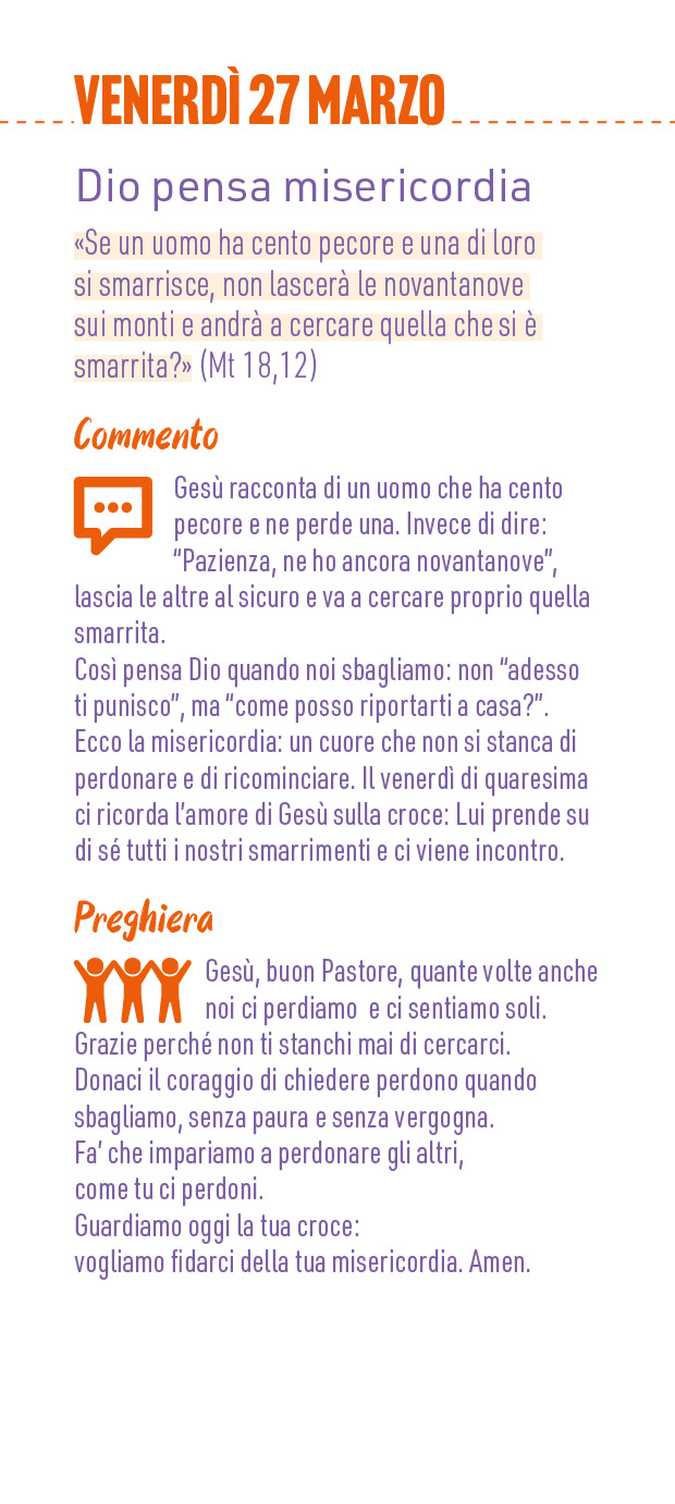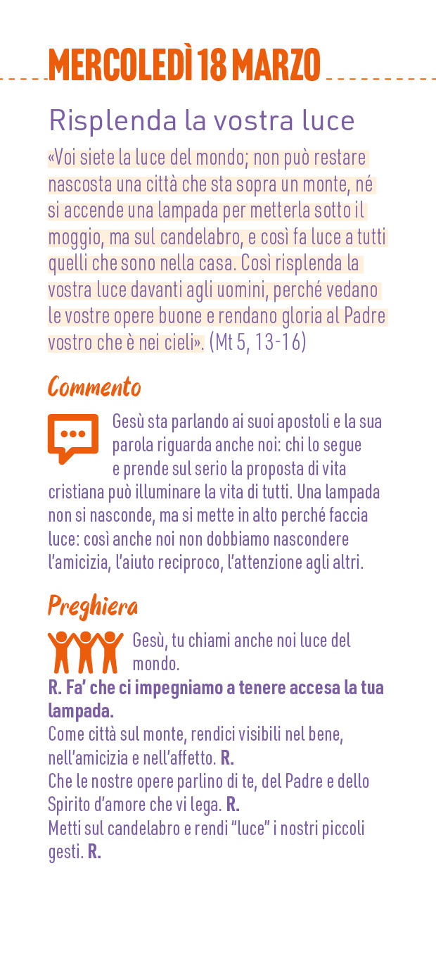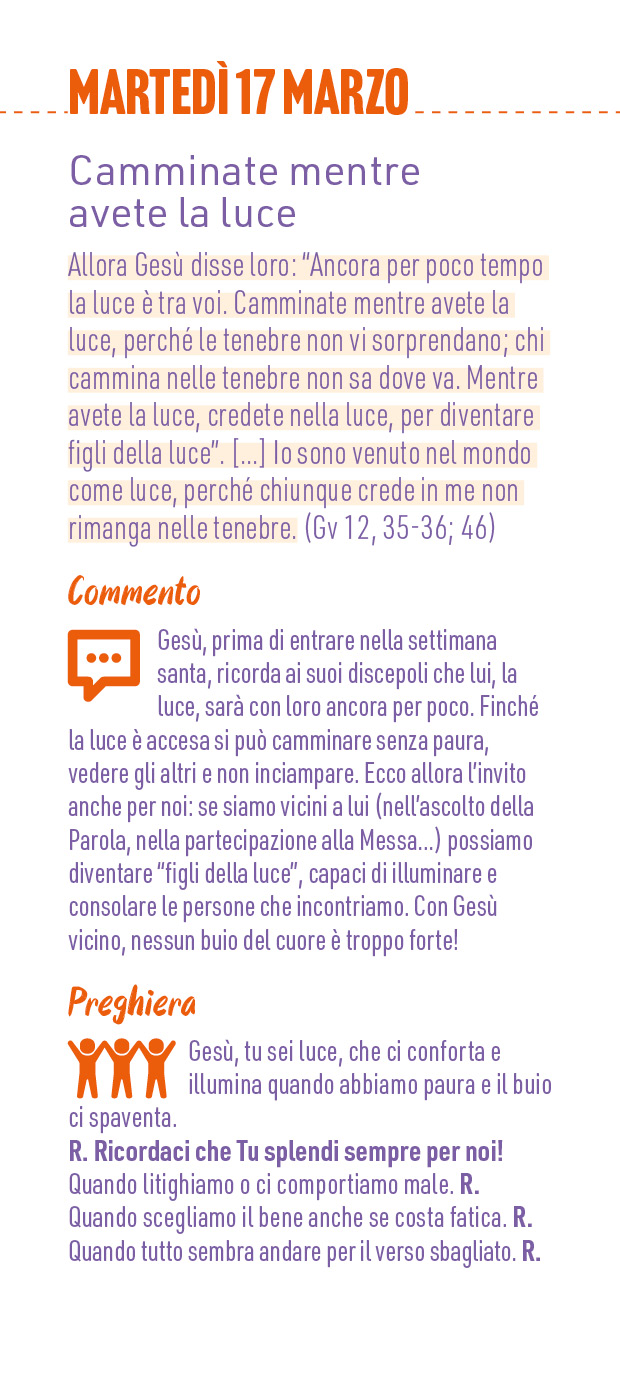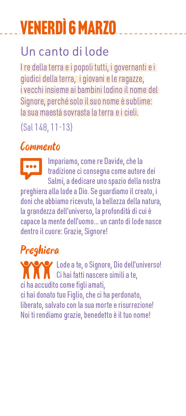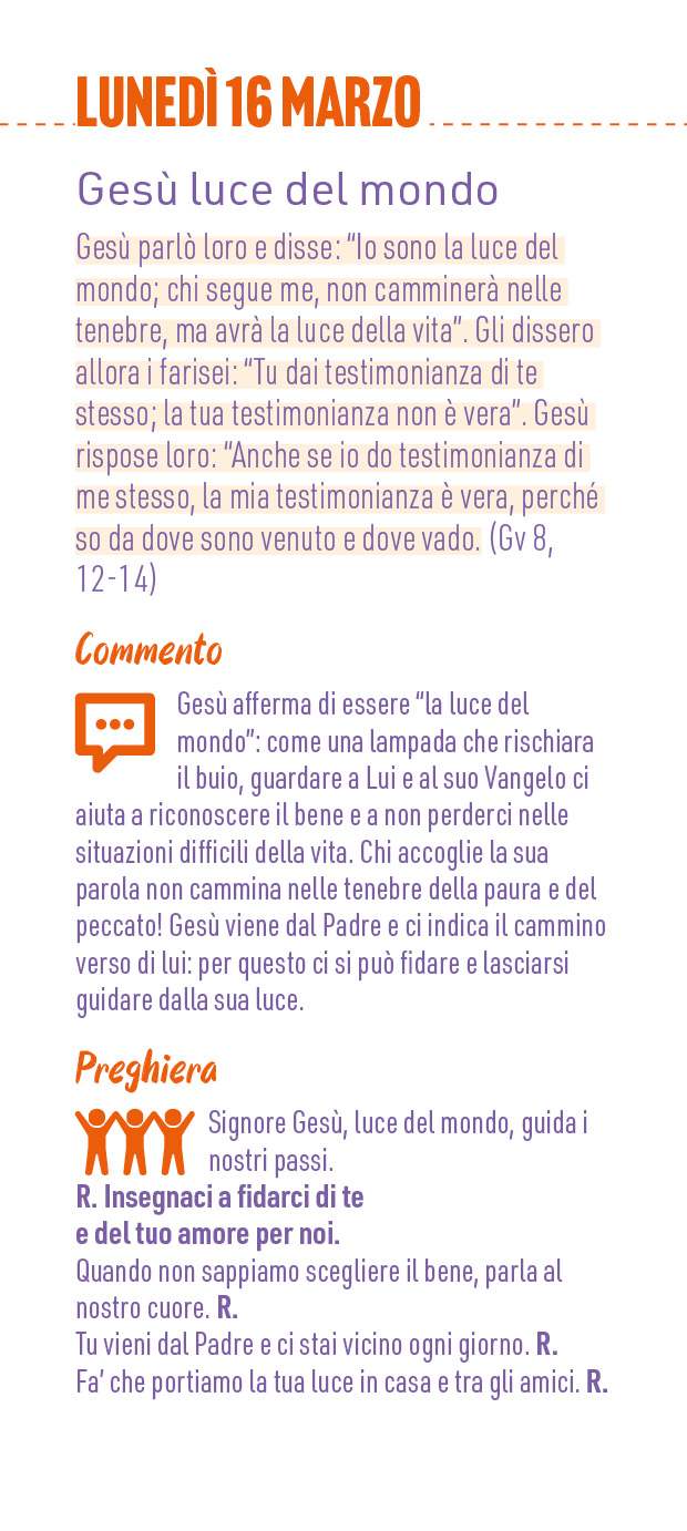 La proposta di preghiera per i bambini e i ragazzi, sarà scandita da alcuni versetti di questo Salmo che, settimana per settimana, ci aiuteranno ad entrare sempre più profondità nel cammino di quaresima dell’anno A.