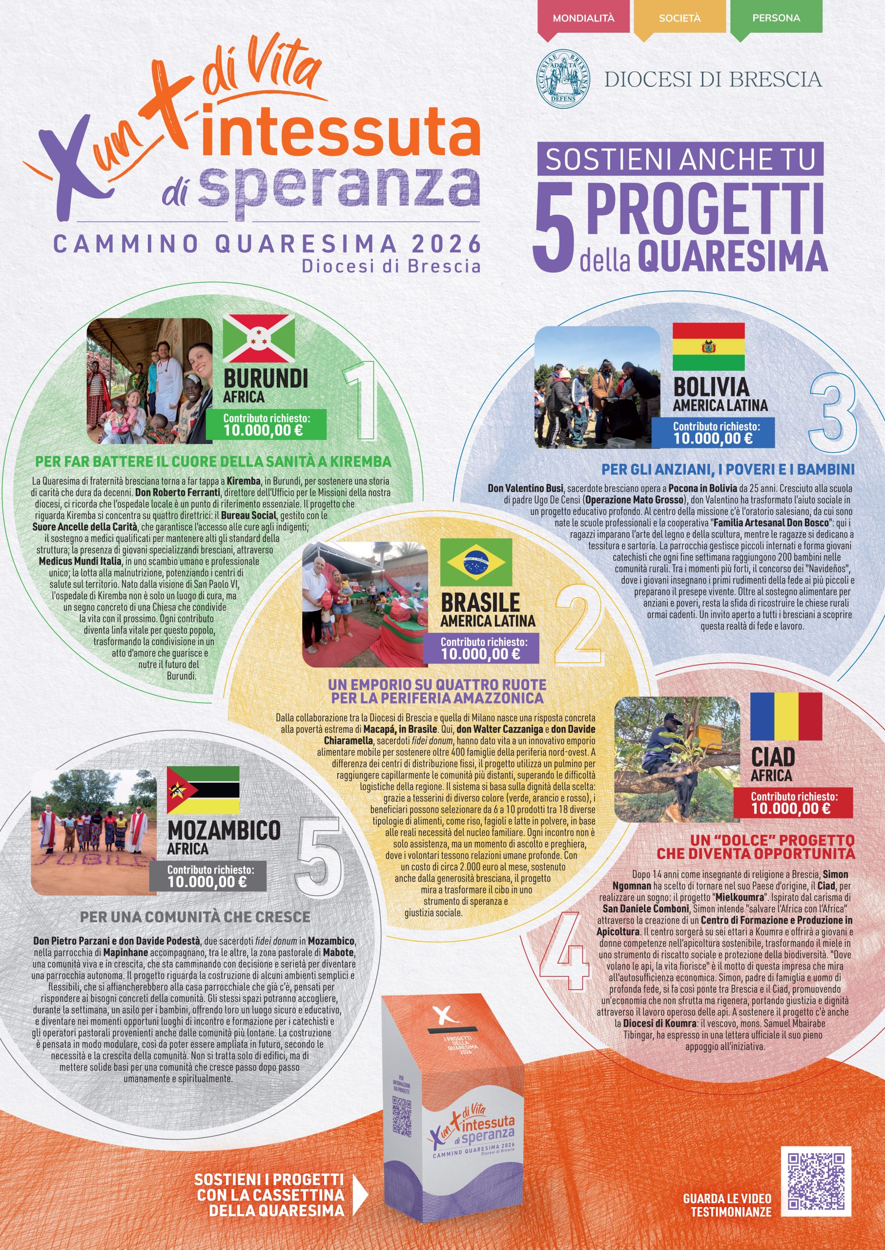 Sono semi piantati in terre lontane che possono ricevere linfa vitale dalla generosità bresciana. Cinque progetti, un unico obiettivo: mettere l'uomo al centro. Sostenere queste realtà significa tessere un filo di speranza che non conosce confini.