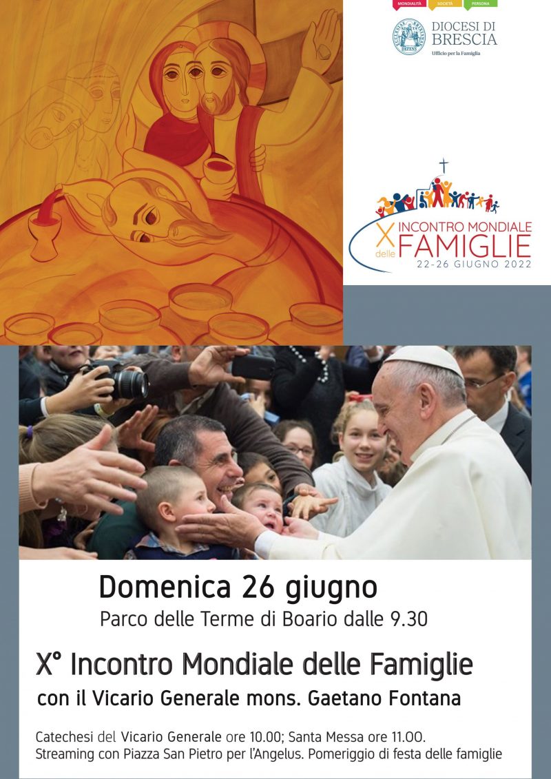 Domenica 26 giugno al parco delle Terme di Boario, incontro con il Vicario Generale mons. Gaetano Fontana. Catechesi del Vicario Generale ore 10.00; Santa Messa ore 11.OO. Streaming con Piazza San Pietro per l’Angelus. Pomeriggio di festa delle famiglie. Quest’anno si celebra in tutto il mondo cristiano il X Incontro Mondiale delle Famiglie: l’evento avrà infatti un carattere multicentrico e non sarà, come nelle precedenti … Continua a leggere