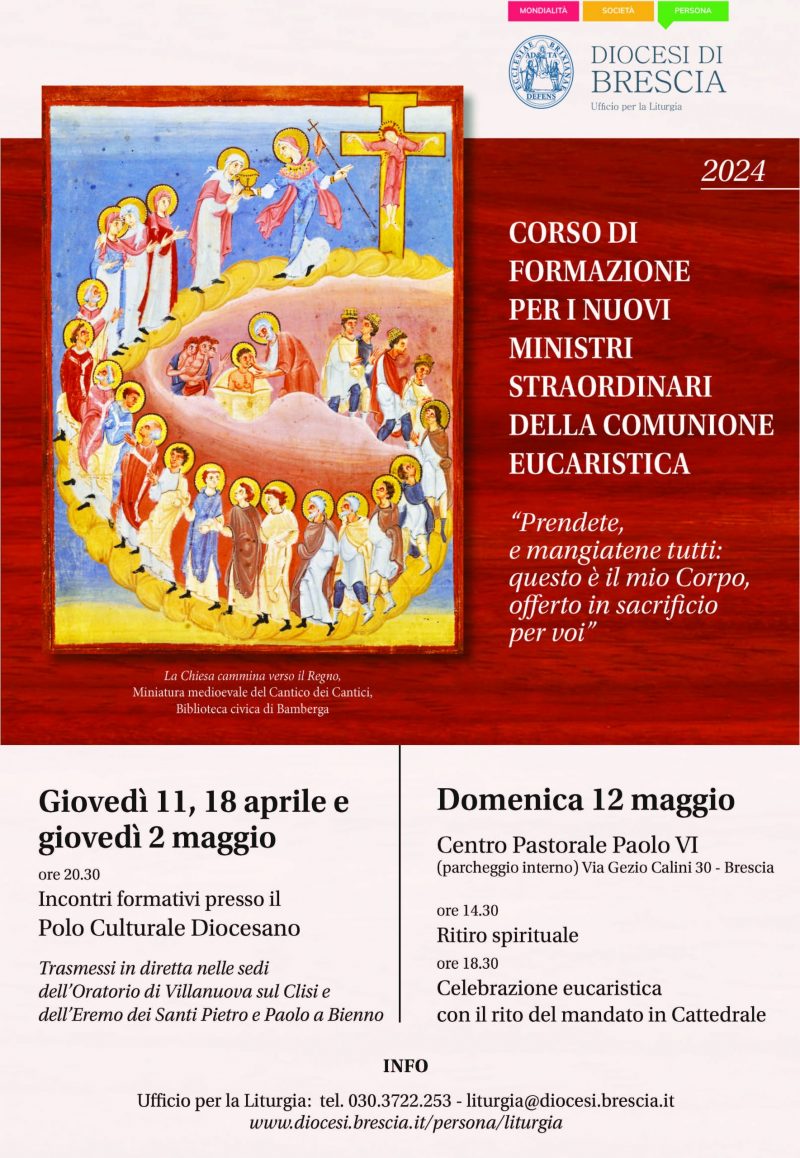 Corso per i nuovi Ministri Straordinari della Comunione Eucaristica ad aprile 2024: per iscrivere i nuovi ministri il parroco deve compilare l’apposito modulo. Il modulo per l’iscrizione dovrà essere firmato dal parroco stesso e avere il timbro della parrocchia, e deve essere consegnato presso l’Ufficio per la Liturgia o in Segreteria Generale, oppure a:  liturgia@diocesi.brescia.it. La quota d’iscrizione al corso per ciascun ministro è di … Continua a leggere »