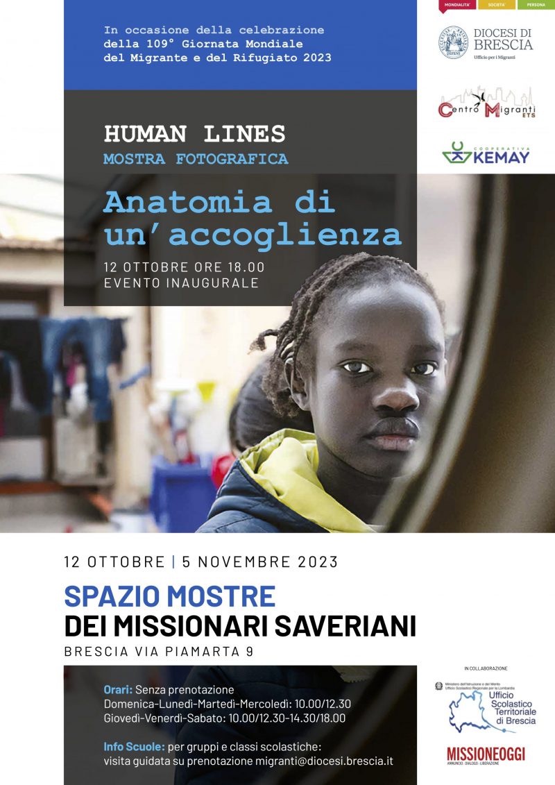 Da Giovedì 12 Ottobre a Domenica 5 novembre 2023 presso lo SPAZIO MOSTRE dei MISSIONARI SAVERIANI (via Piamarta 9 a Brescia), potrà essere visitabile la mostra fotografica “HUMAN LINES, Anatomia di un’accoglienza”. Cosa significa accompagnare? Integrazione è sempre la parola giusta? Cosa è clash culturale, si possono fare dei danni in buona fede? Qual è la giusta distanza nell’accoglienza? Sono alcune delle domande e delle … Continua a leggere »