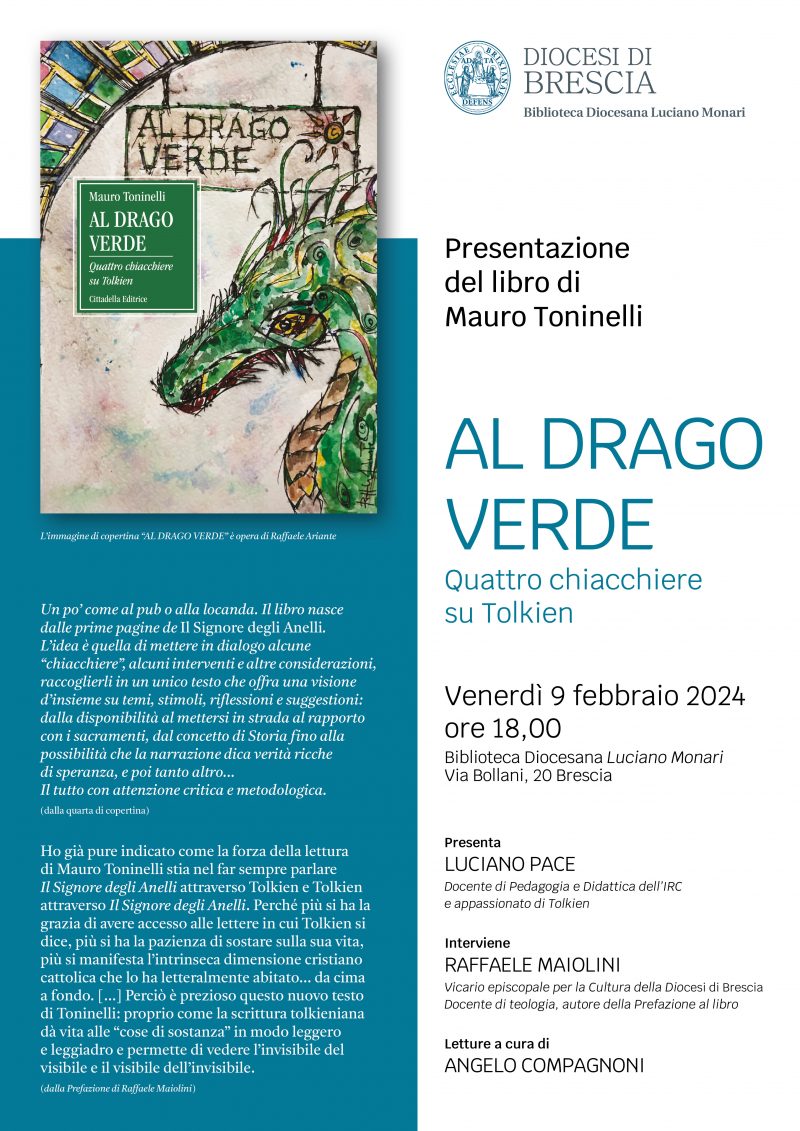 Venerdì 9 febbraio 2024 ore 18.00, presso la Biblioteca diocesana, verrà presentato il libro di Mauro Toninelli “Al drago verde. Quattro chiacchiere su Tolkien”. Presenta Luciano Pace, Docente di Pedagogia e Didattica dell’IRC e appassionato di Tolkien Interviene Raffaele Maiolini, Docente di Teologia, Vicario episcopale per la Cultura della Diocesi di Brescia; autore della Prefazione al libro Letture a cura di Angelo Compagnoni Un po’ … Continua a leggere