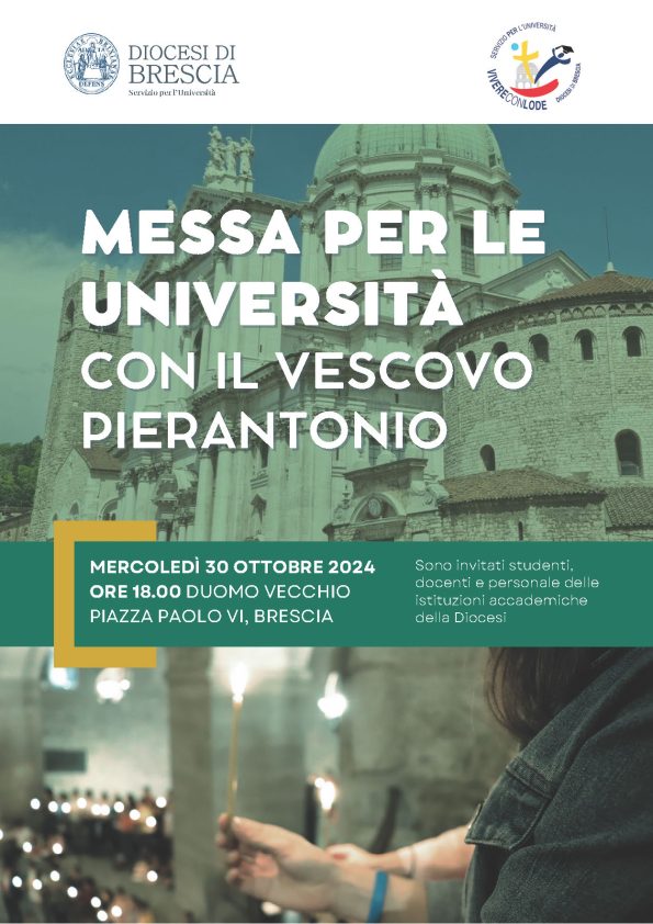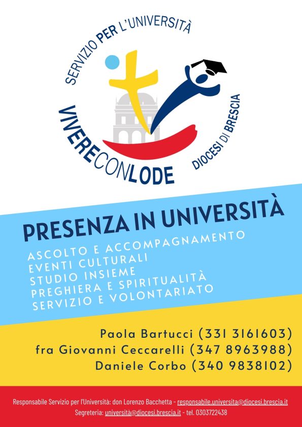Il Servizio per l’Università esprime l’attenzione e vicinanza della Chiesa bresciana per il mondo universitario, in dialogo con le istituzioni, con gli enti, le fondazioni e le associazioni operanti nel sistema: l’Università degli Studi, l’Università Cattolica del Sacro Cuore, Accademia di Belle Arti Santa Giulia, Libera Accademia Belle Arti, Conservatorio Luca Marenzio, Istituto teologico Paolo VI, Istituto Superiore di Scienze Religiose.