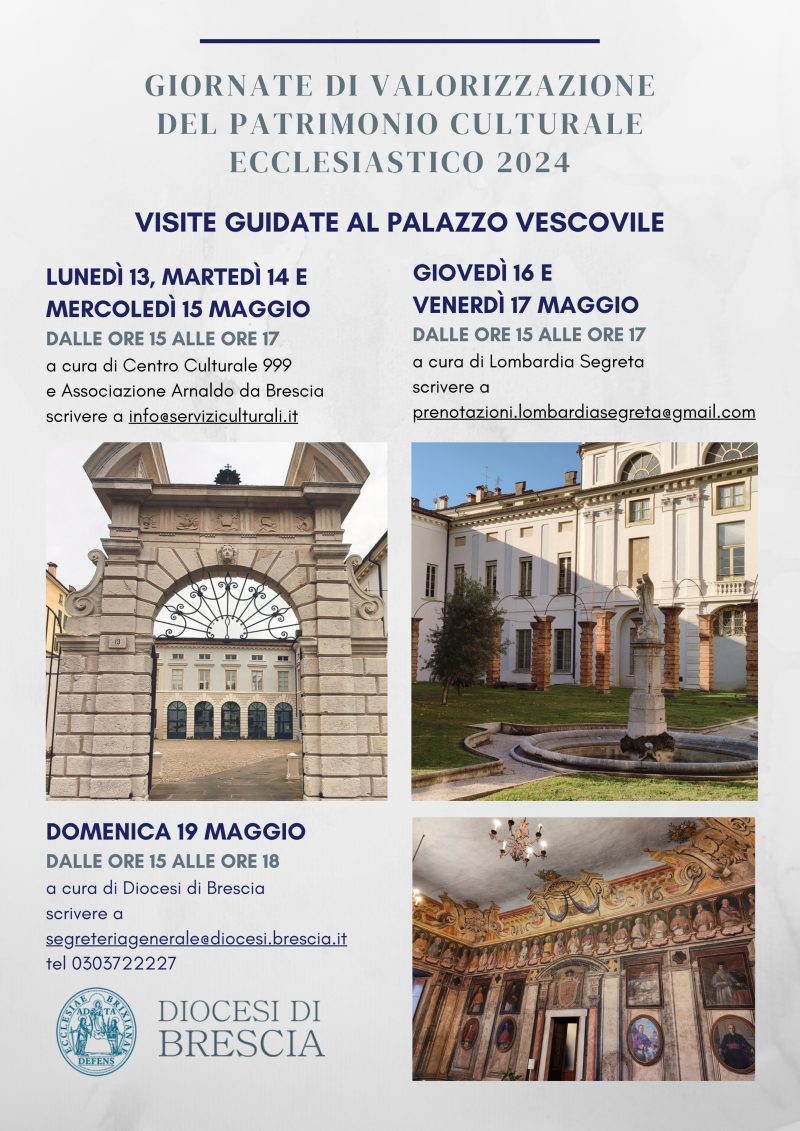 In occasione delle Giornate di valorizzazione del patrimonio culturale ecclesiastico 2024, la Diocesi di Brescia offre un pomeriggio di visite guidate al Palazzo Vescovile, domenica 19 maggio in tre turni alle ore 15, 16 e 17. Per partecipare è necessario segnalare la propria presenza scrivendo a segreteriagenerale@diocesi.brescia.it